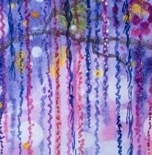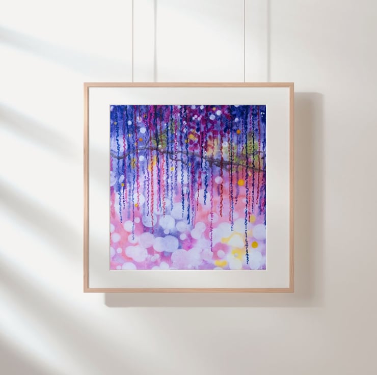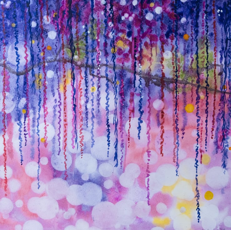 An original watercolour a majestic willow tree with long, slender branches drooping down towards the ground. The tree is alive with abstract warm shades, from the lightest yellow to the darkest purple, and is softly blurred to create a dream-like aura.