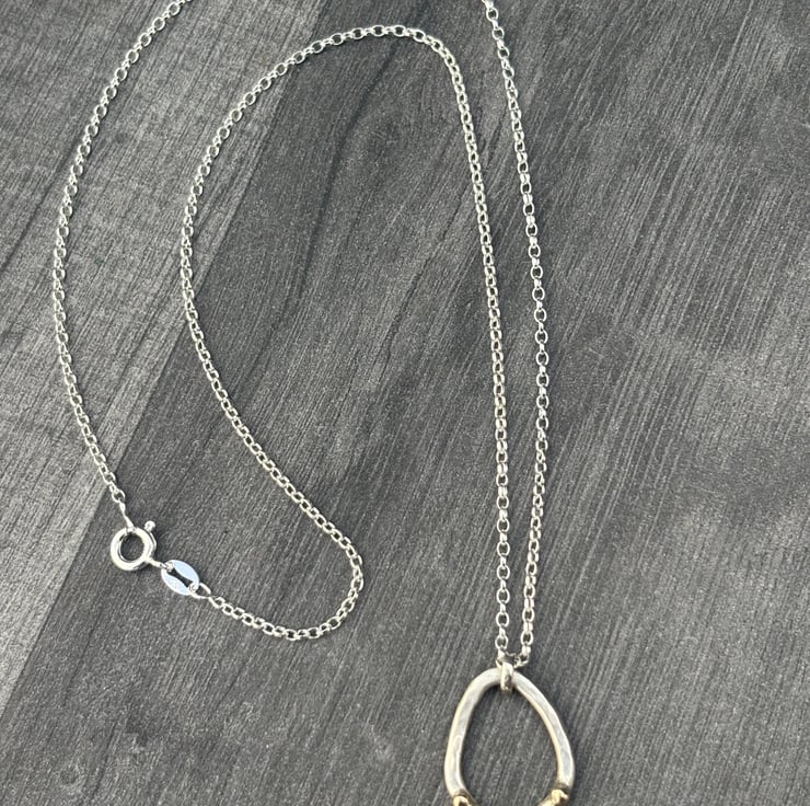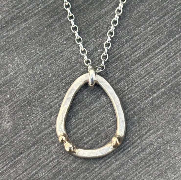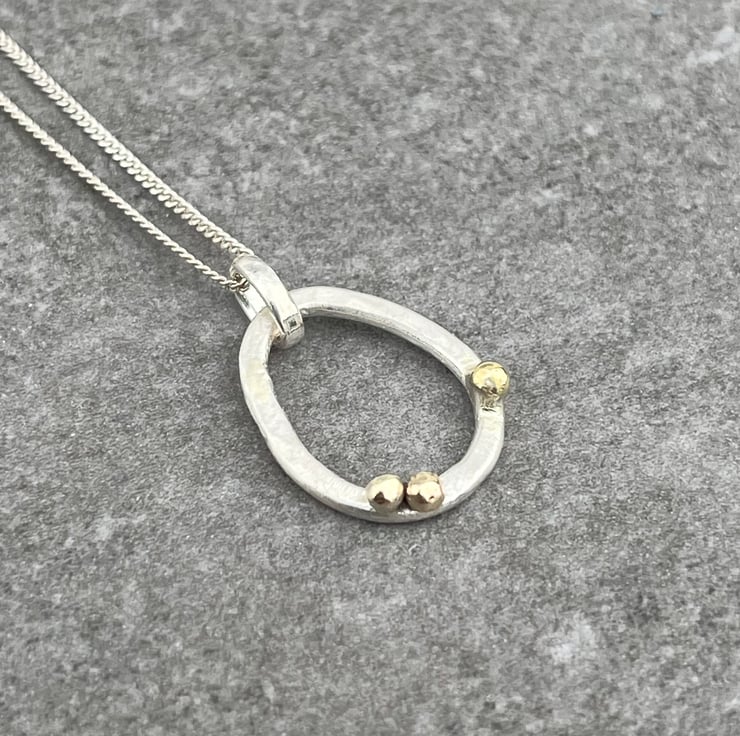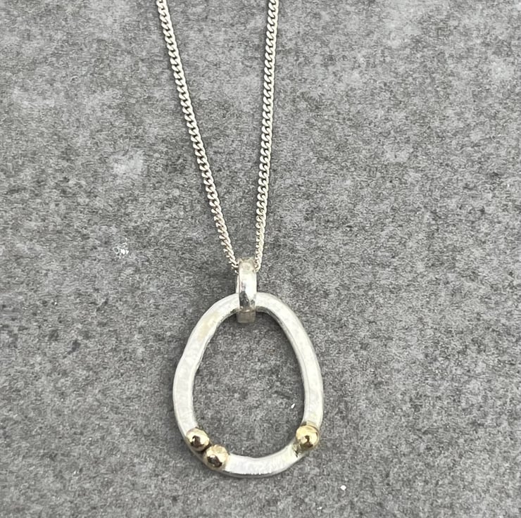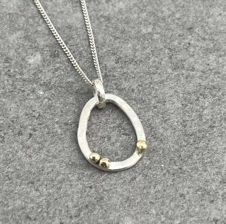 This hammered Sterling Silver, round wire pendant has 9ct gold ‘bubbles’ detail. The Silver has a brushed effect which contrasts beautifully against the high polished gold. The pendant height is approximately: 1.8cm and the width is approximately: 1.4cm and it hangs on an 18” Sterling Silver chain.