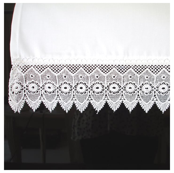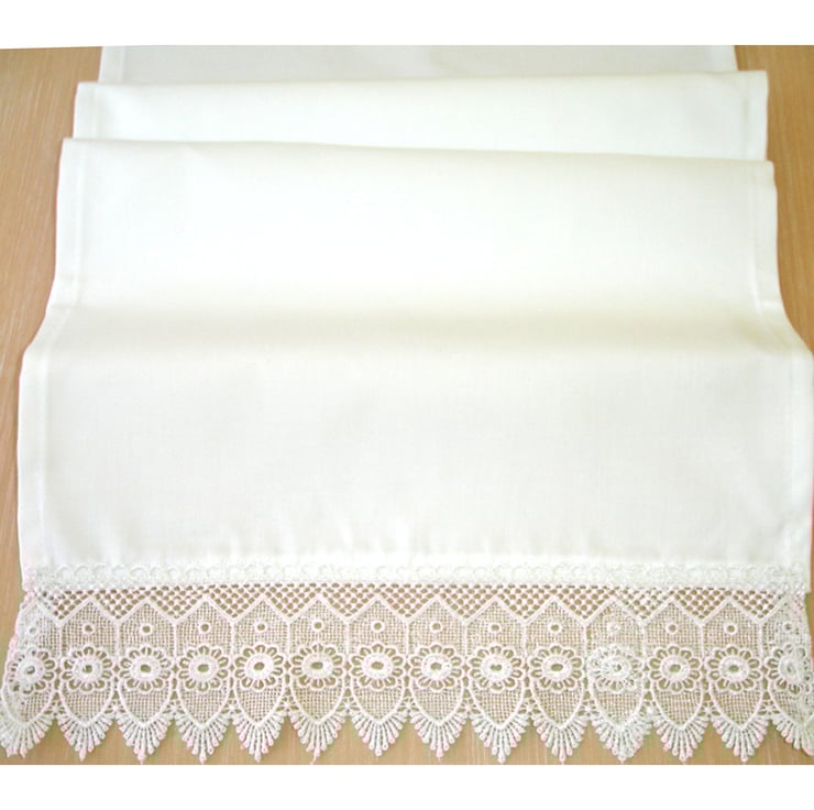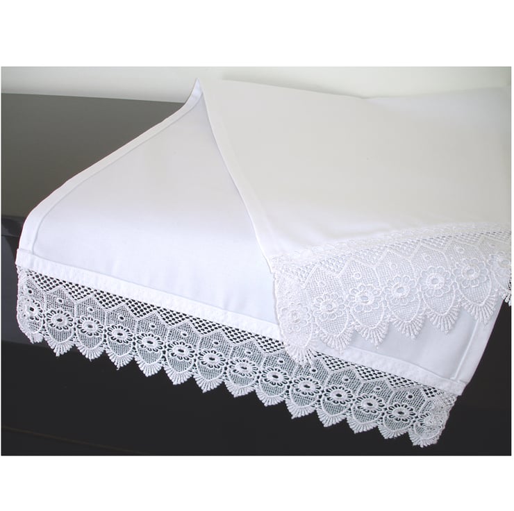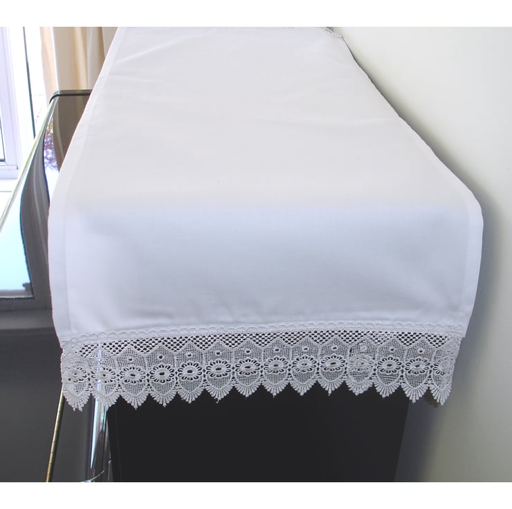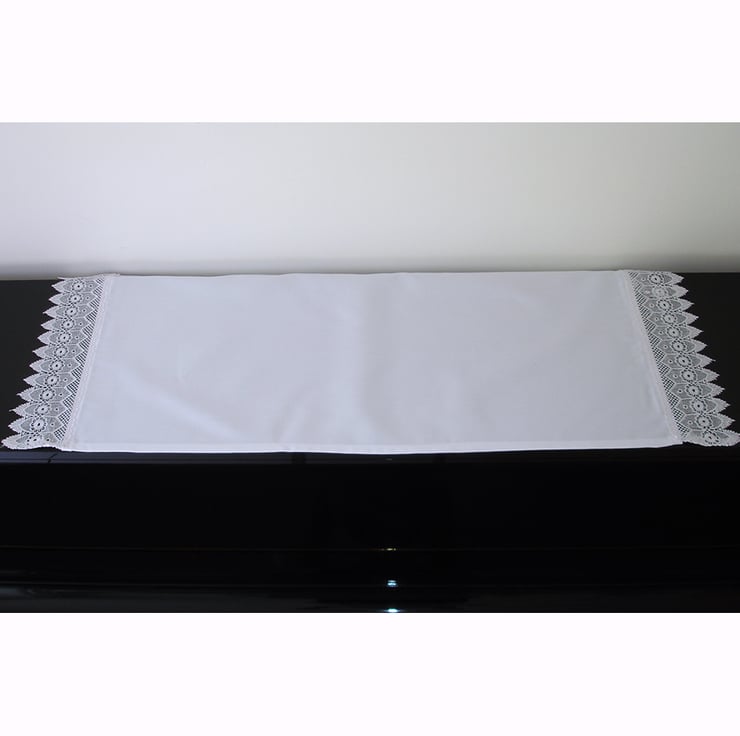 This cloth measures approx 90cm x 35cm (36" x 14") and has an 8cm Pointed Flower lace trim at the shorter ends (included in the measurements).