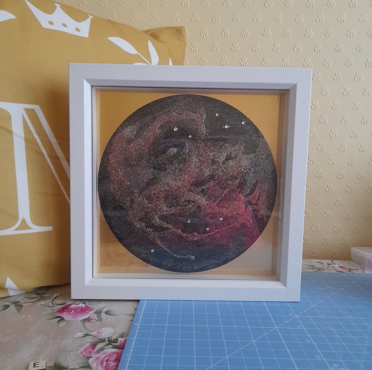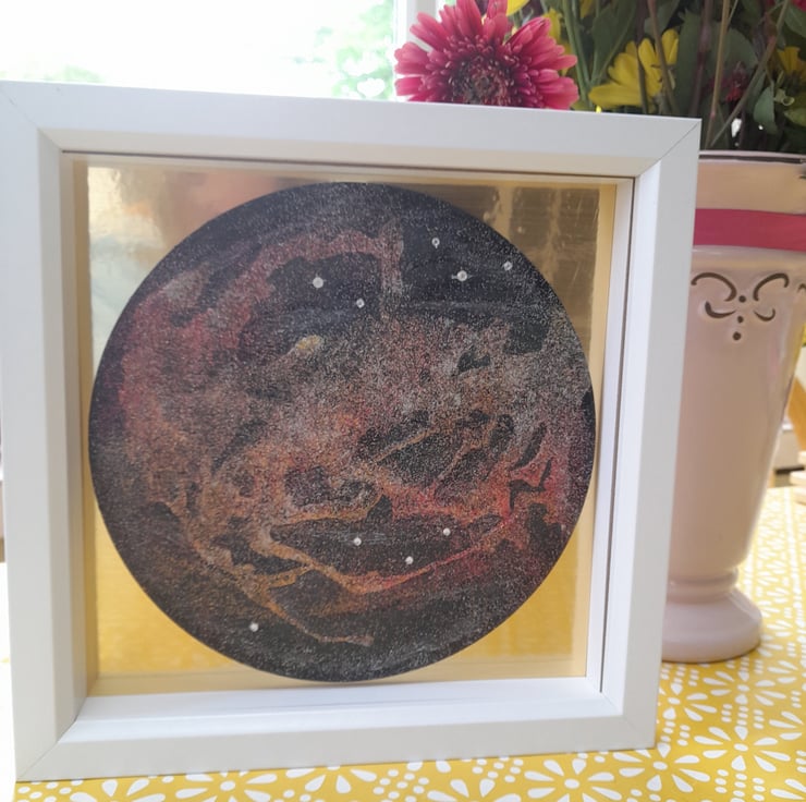 This is a wooden disk hand painted with acrylic paint and craft resin for texture. Multicoloured glitter has been used for effect. Also, a few little diamanté sequins.The backing is a gold pvc film. The frame is 15cm x 15cm. White. Can be Wall mounted.