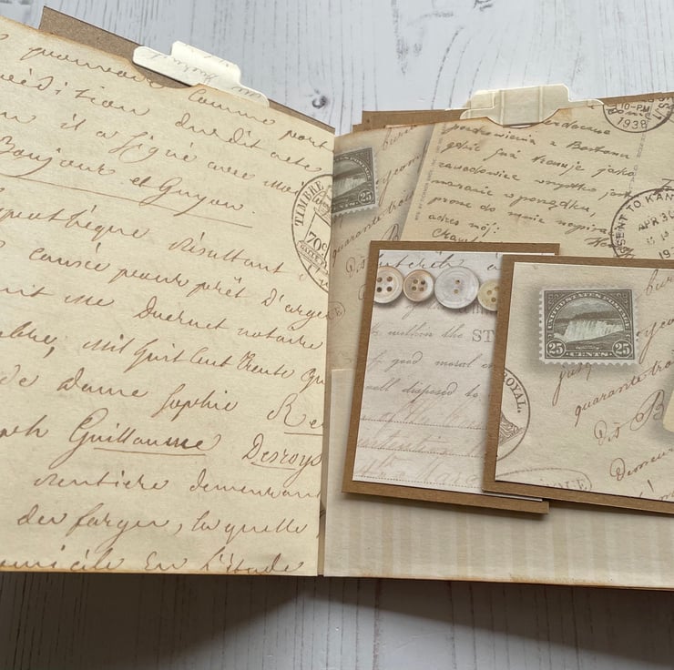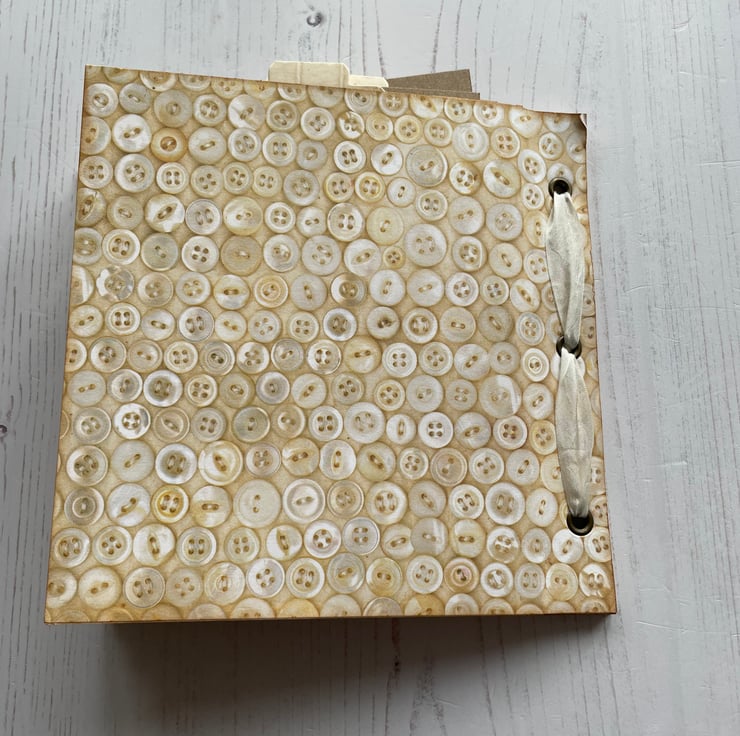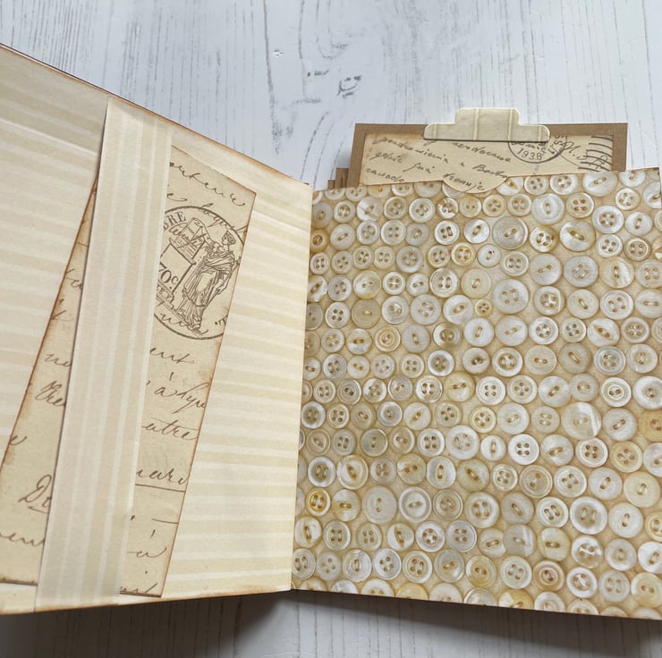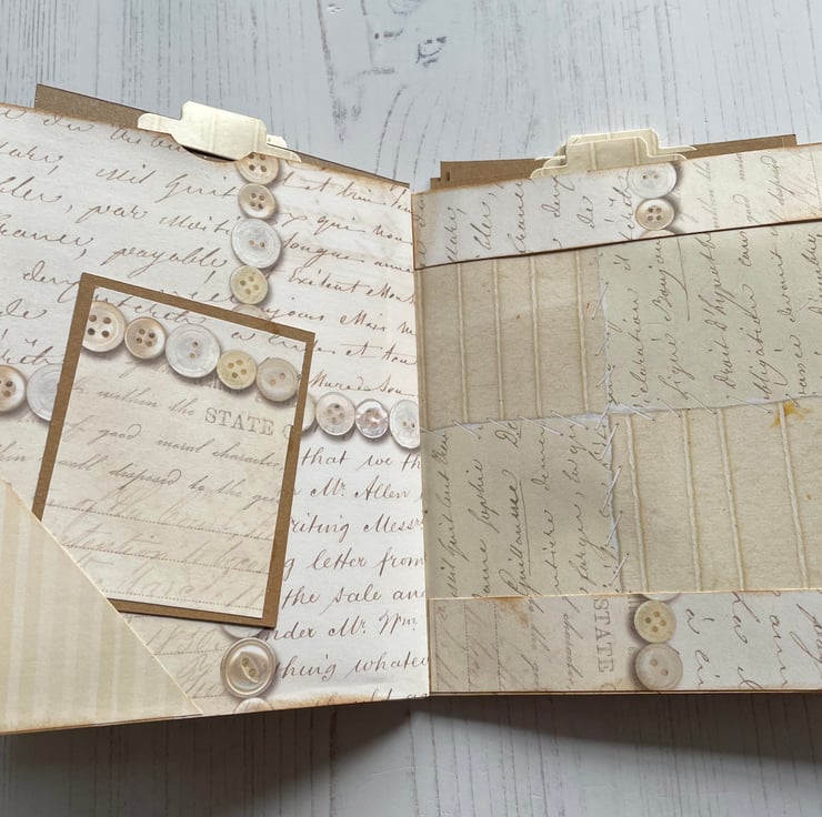 6 x 6” pocket album using papers from Life’s Journey collection. There are tuck spots, pockets and 6 top pockets with large tags. Muted colours, lots of buttons and script. Space for approx 20 photos. Ties with faux silk ribbon.