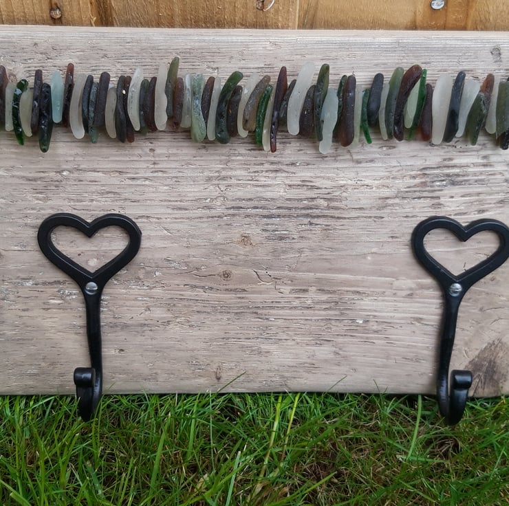 So here we have a very bespoke unusual yet very useful coat hanger, with heart shaped hooks and sea glass, wood washed up on beach, very rustic adding a touch of the sea side, all found on beaches in Cornwall (except hooks) large piece, approximately 17.5" wide, 8.5" long and just under 1.5" deep. Holes and hangers on the back so ready to hang in any room, bringing a little bit of Cornwall into your home. An idea for you if you prefer the sea glass to look as if has just been picked from the sea, brush with a little sun tan oil, smells nice too.... brush with water initially to see if you like it!