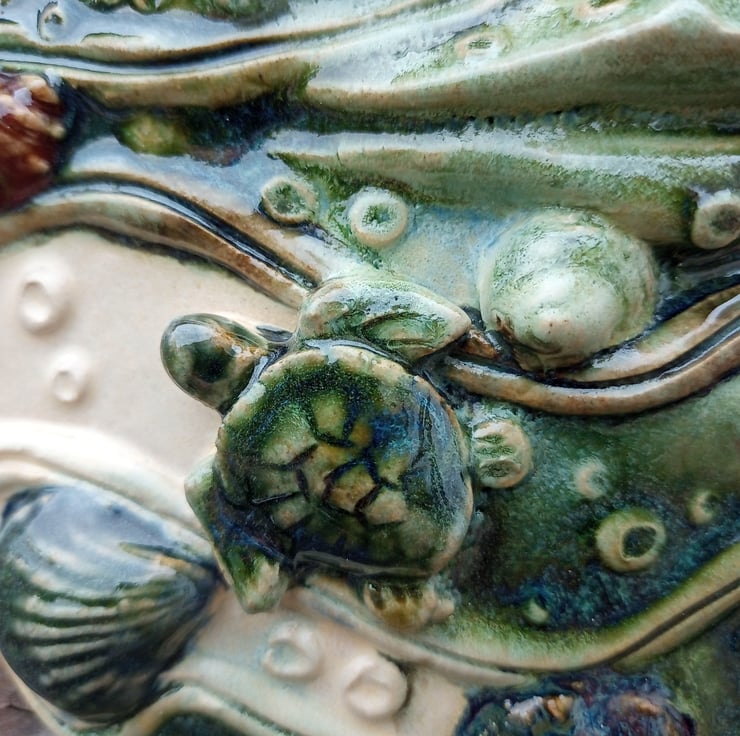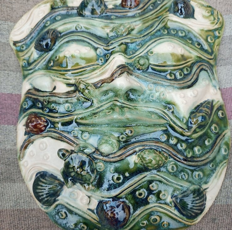 A glazed stoneware, wall hanging mask. Adorned with shells, barnacles and a pair of tiny turtles, this mask will evoke memories of sunny afternoons spent hunting for shells and other treasures on the shoreline. 9 X 7 inches.