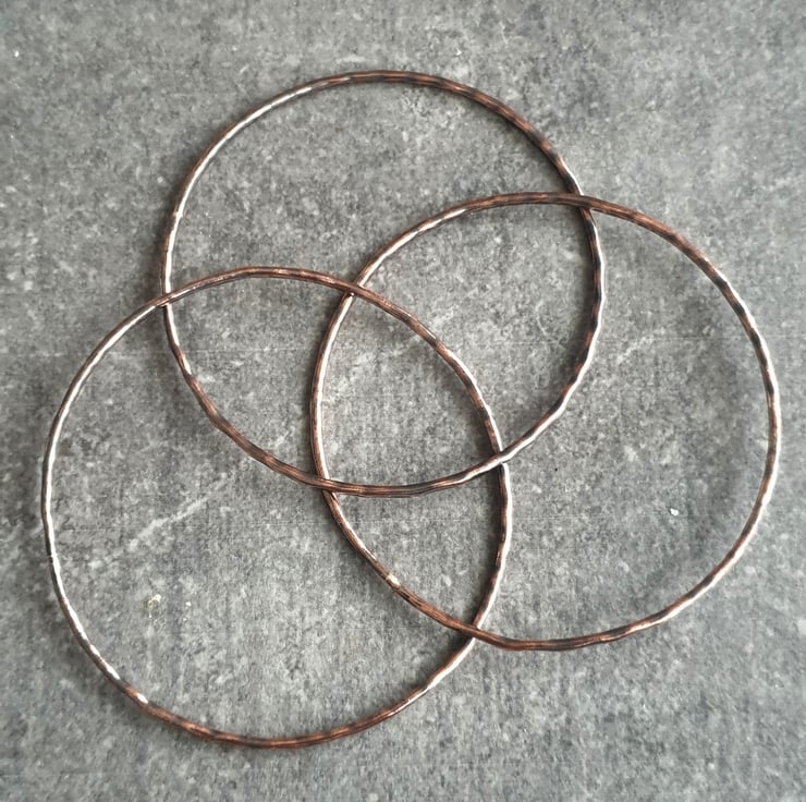 This copper bangle set is made in the style of a Russian wedding ring: three bangles have been individually made and then linked together to make a permanent interlocking set. The bangle trio has a lovely rolling motion when put over the hand.