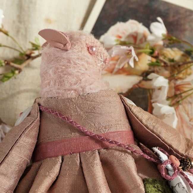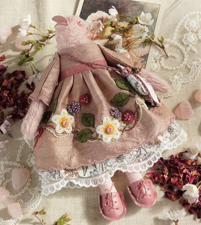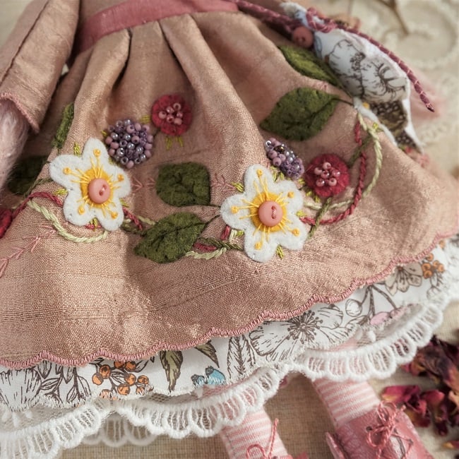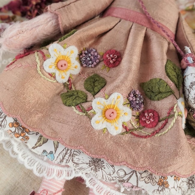 This little mouse is a complete one off. Her dress is hand dyed with brambles from the woodland behind my garden. Fixed with an alum mordant and sugar, the vintage silk is one of those colours that you can only achieve with natual dyes. The flowers have a button eye and each bramble berry is picked out in french knots and beads. She was a joy to make xx
