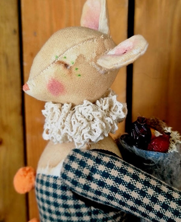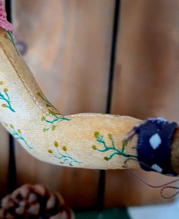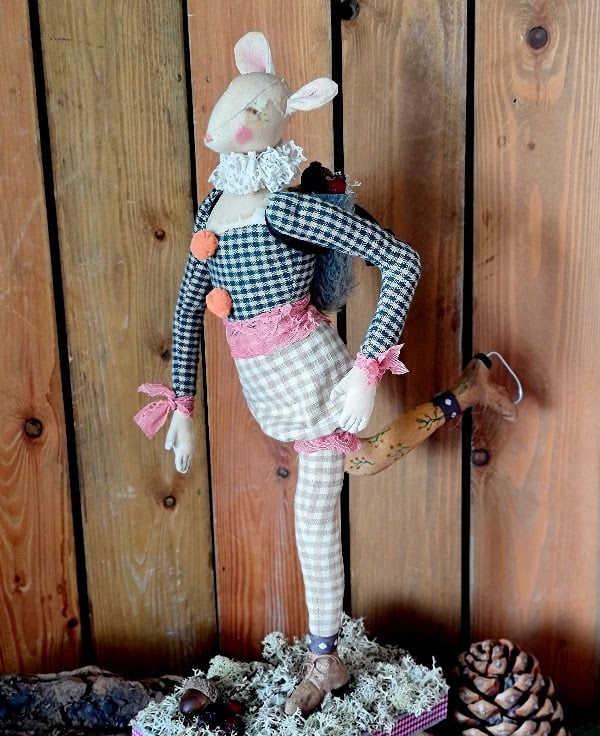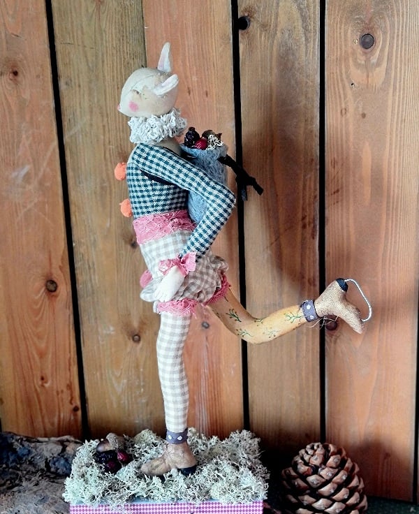 This piece is hand and machine stitched in unbleached cotton as well as hand stained and hand painted. Mouse is wearing little Victorian style bloomers edged with dusky rose lace, which is also around her waist and wrists. On her back is a vintage blue german mohair backpack with suede straps and tie, in it is stored all the finds of the forest acorn and berries. Mouse is mounted on a wood plinth covered in dry moss, sitting amoung the moss are an acorn and berries.