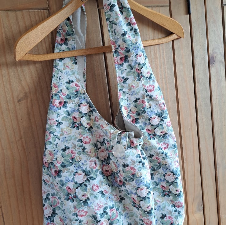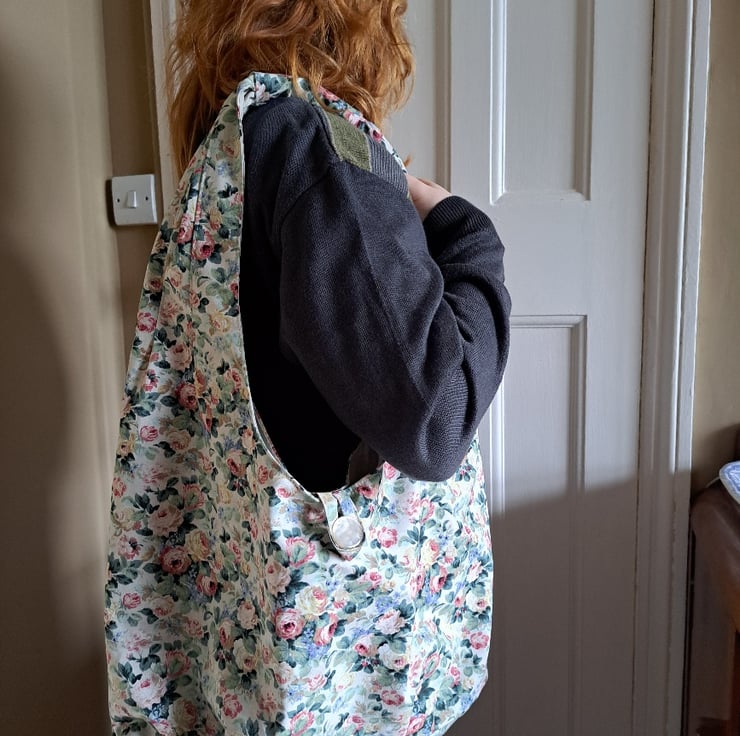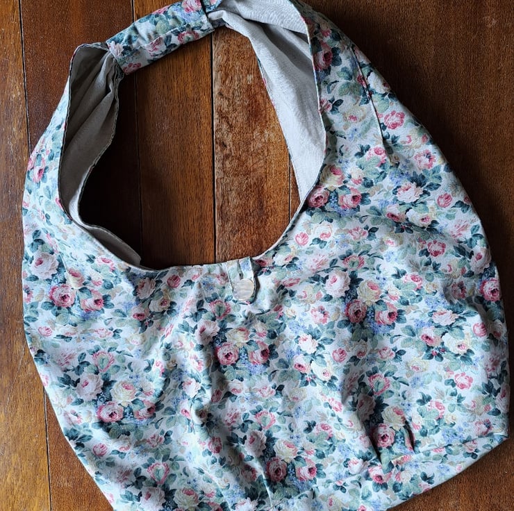 A big, beautiful, romantic statement of a slouch bag - or hobo bag, if you'd rather. Made from a piece of vintage cotton covered with tumbling roses on a cream background, and lined with beige linen. It's got pockets, a vintage button closure and plenty of room inside. Measures a generous 63cm across and 70cm high. Feminine but tough.