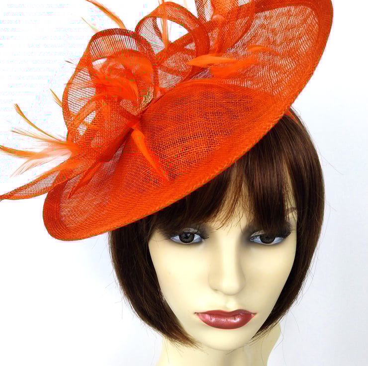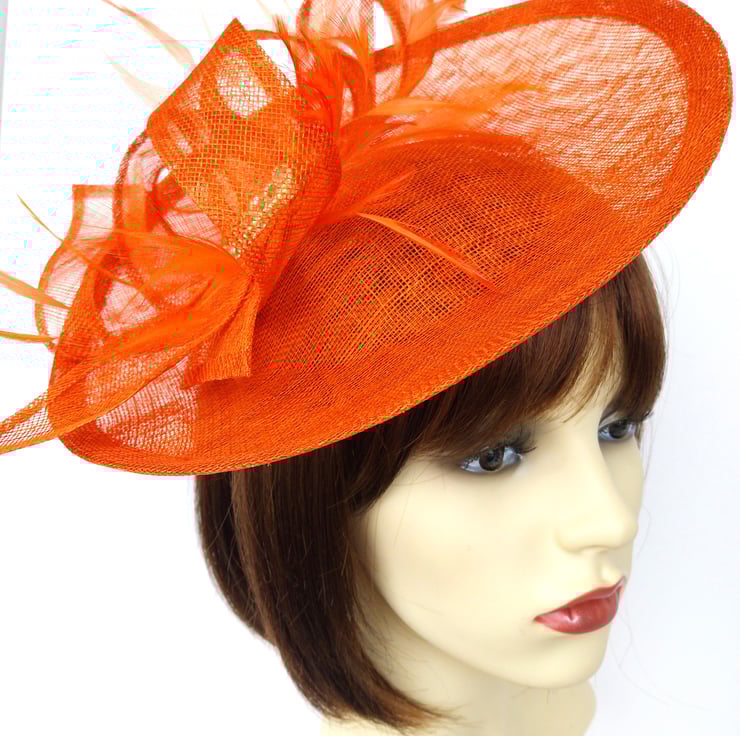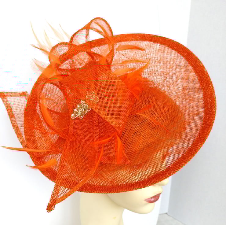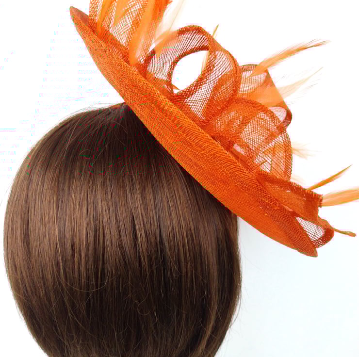 I have used burnt orange colour sinamay for this hatinator. The hatinator is decorated with sinamay ribbons and curls and is further embellished with hackle feathers. It sits on a band covered in orange ribbon. In the centre is a small gold-coloured applique. It is made to be worn on the right side.