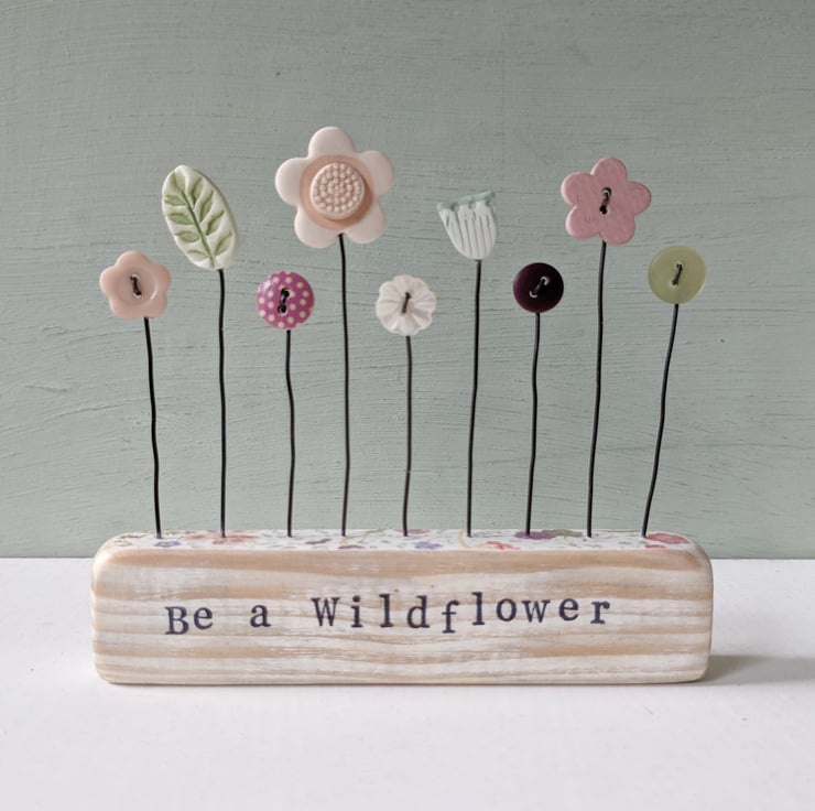 Button flowers grow in a row in this little garden with a clay leaf and flower. They stand on their wire stalks in a wooden block with a decoupaged floral top.