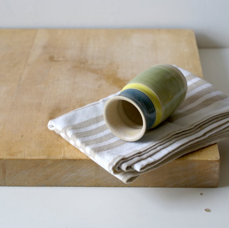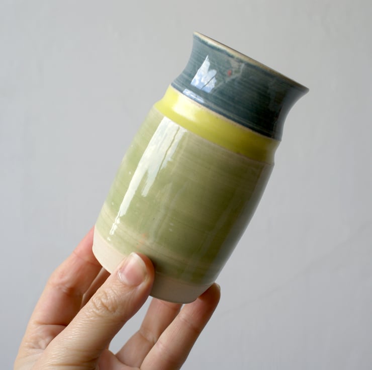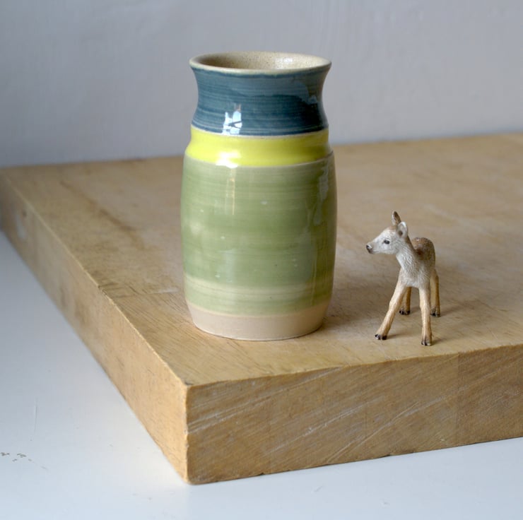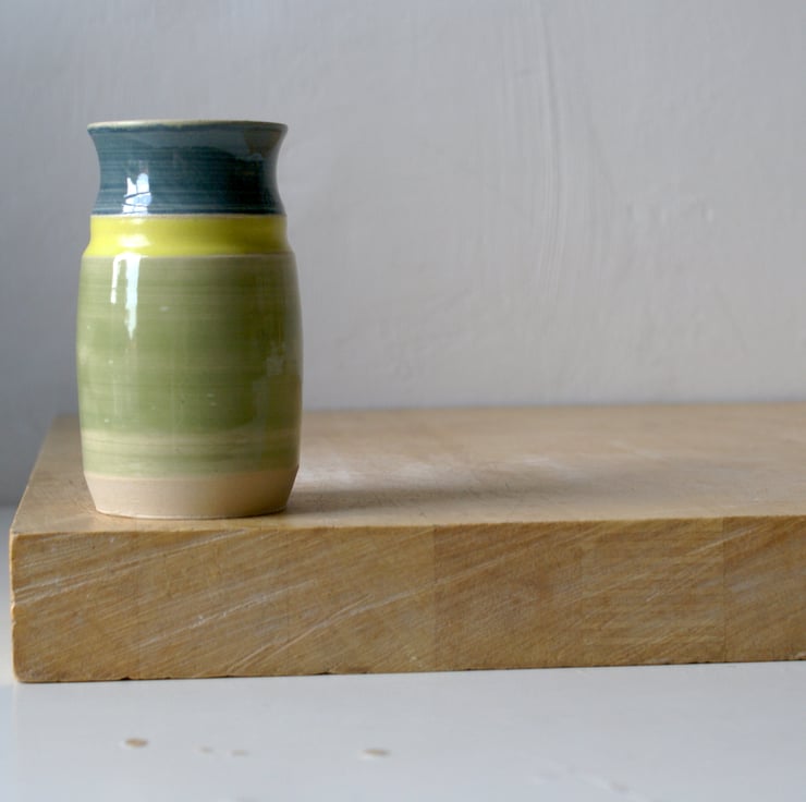 This small ceramic vase was hand thrown from white Devonshire stoneware clay. Its fluted shape is ideal for decorating your home with small cut flowers or use it on your desk to store pens and pencils. It's been glazed in bands of blue, green and yellow which have a gloss finish. The inside is glazed simply in a mat beige.