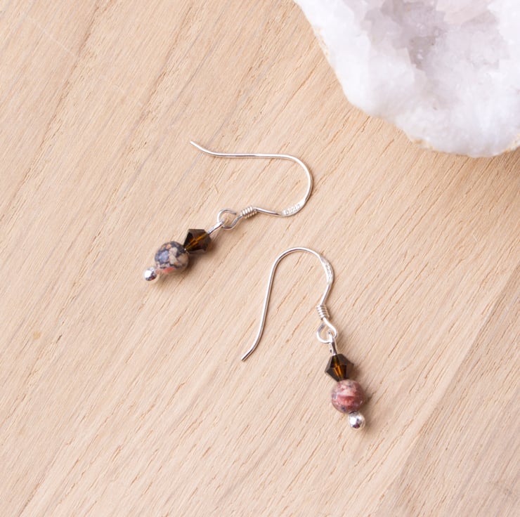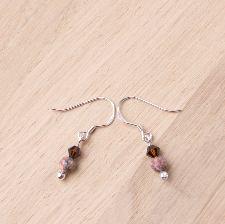These earrings feature adorable crystal bicones and leopard skin agate that dangle from sterling silver ear wires. Measuring at 4mm, they are perfect for those who prefer small and delicate jewelry. With a total length of approximately 2.5cm, including the ear wire, these earrings are great for everyday wear. They are currently available and ready to be shipped.