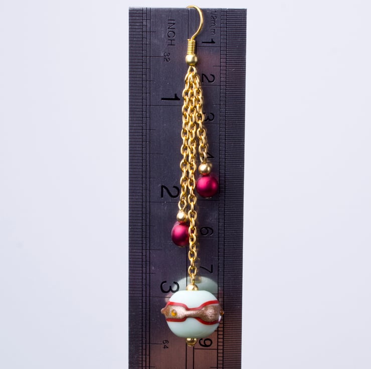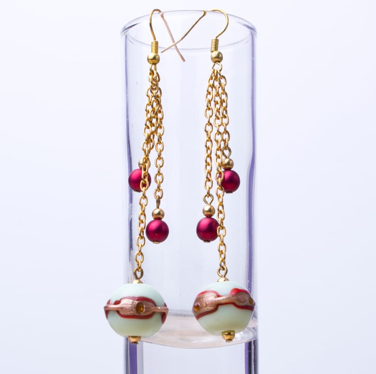 These earrings are truly unique with their handmade, mint green, red, and gold lampwork beads, complemented by red satin glass beads and gold plated accent beads that dangle from gold plated chains. The earrings measure approximately 3.5 inches, including the gold plated ear hooks, making them a lovely addition to any outfit. They are handmade, in stock, and ready to be shipped to you.
