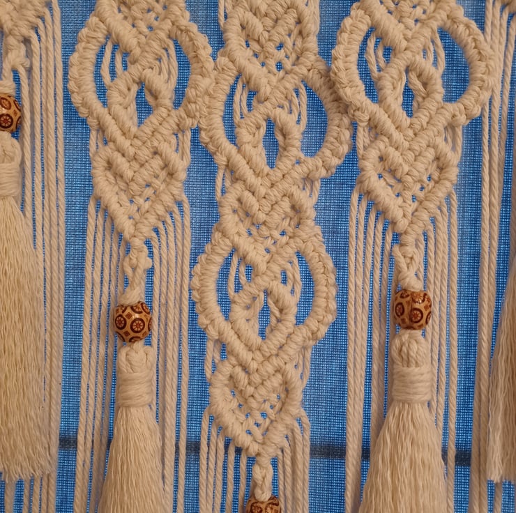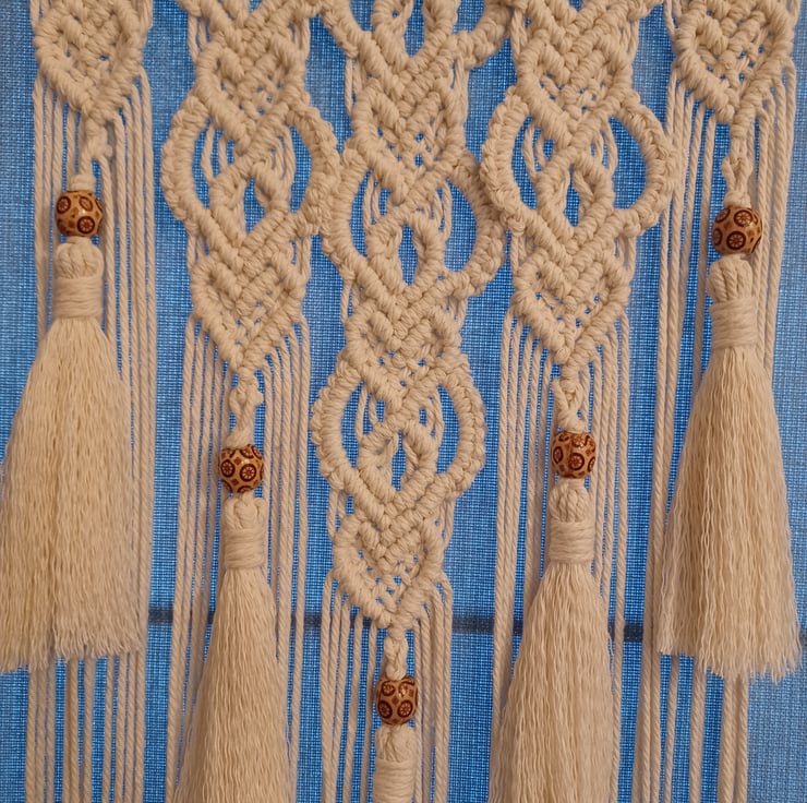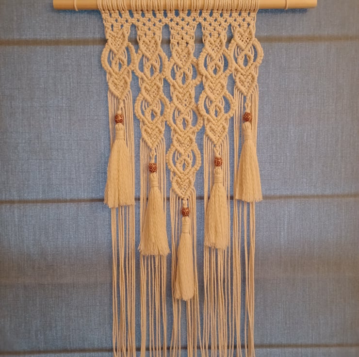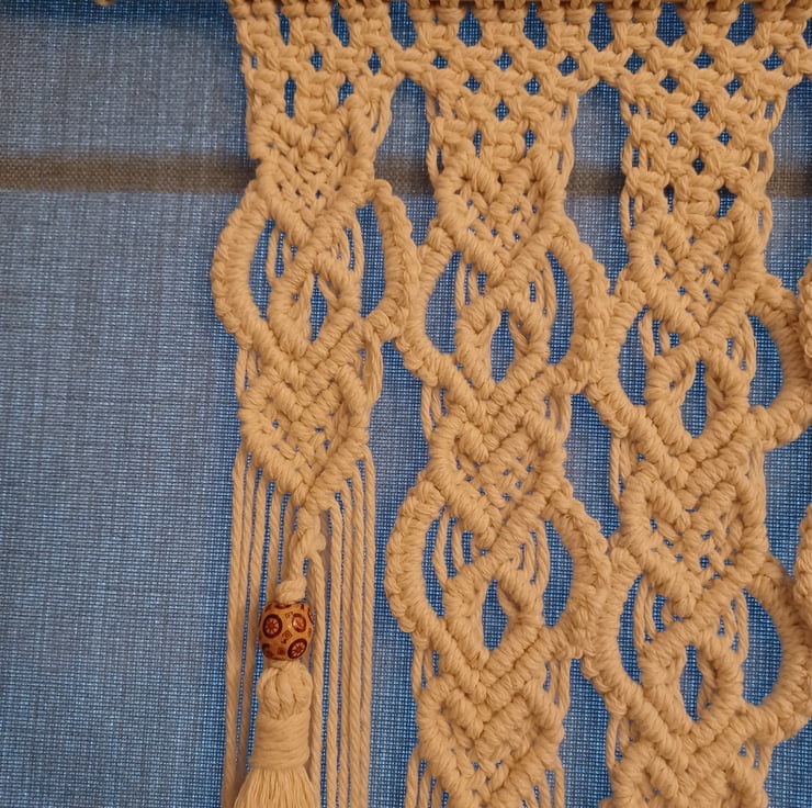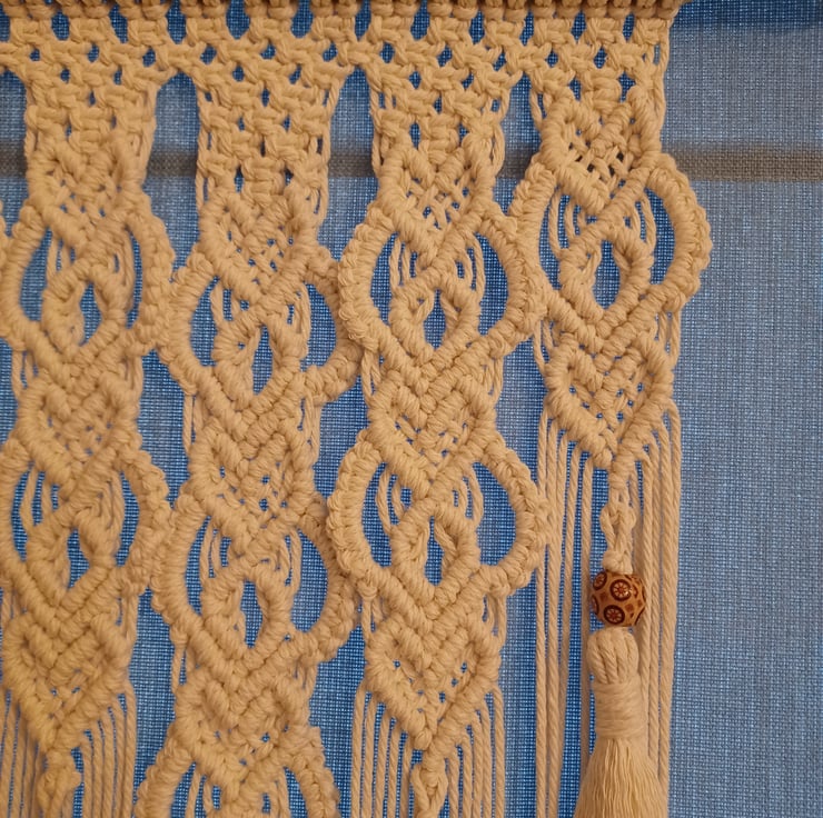 A striking macrame wall hanging made from soft cotton cord. Carefully crafted using a series of different knotting techniques, these intricate patterns ultimately come together to create a beautiful design. This wall hanging starts as a length of dowel hanging off a metal rail with varying lengths of cord attached. It hardly requires any other tools other than my hands, and the knowledge of many different knotting techniques. Certain knots use up more cord than others, so I need to be careful to have measured the correct lengths of cord and put them in the right order on the dowel. Once I'm happy the cords are all where they should be I start the knotting process, carefully ensuring the knots are equal and even as I work across the pattern. Finally, at the end of the pattern the design is secured using wrap knots, sometimes wooden beads, tassels or fringes. These are then trimmed to the required length. This process takes time, patience and skill. It's also a very meditative and relaxing activity which results in a beautifully stylish piece of wall art.