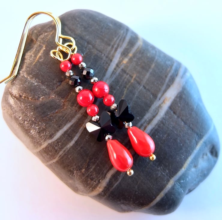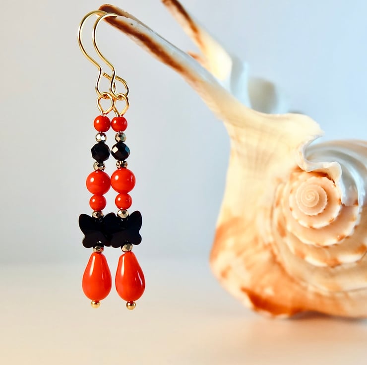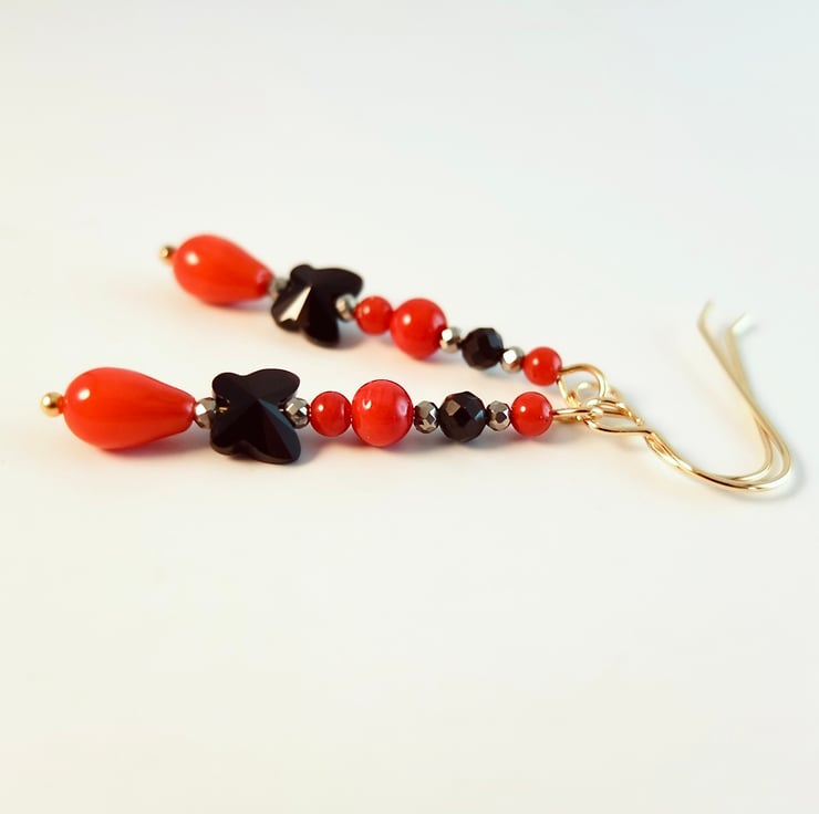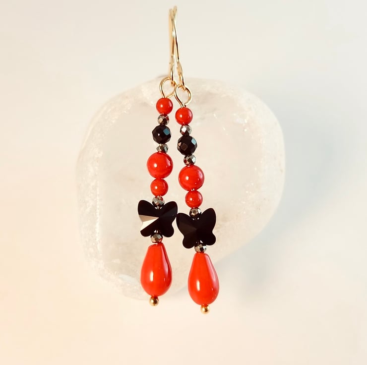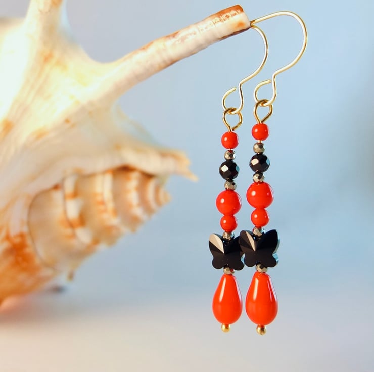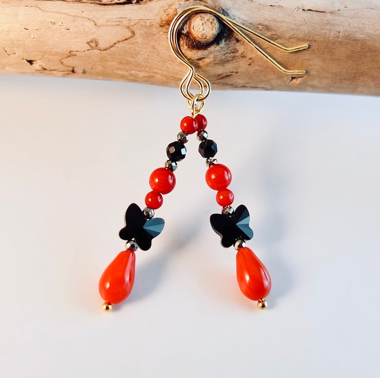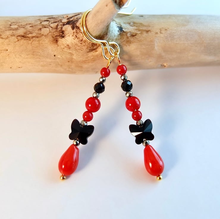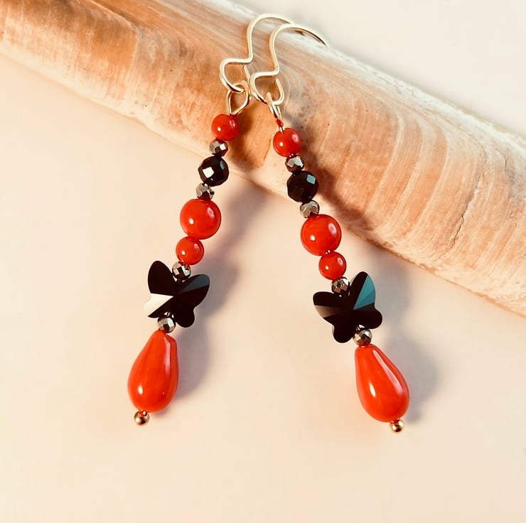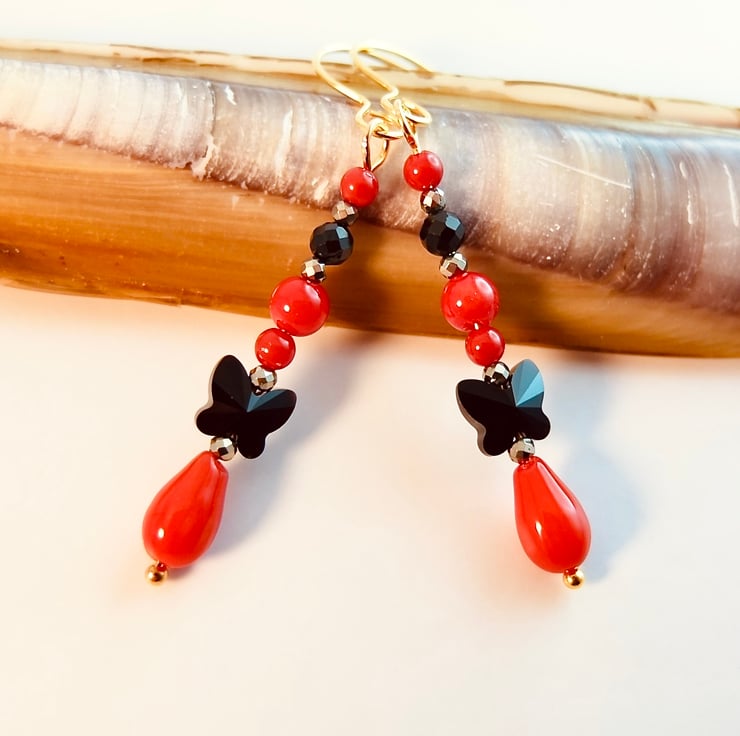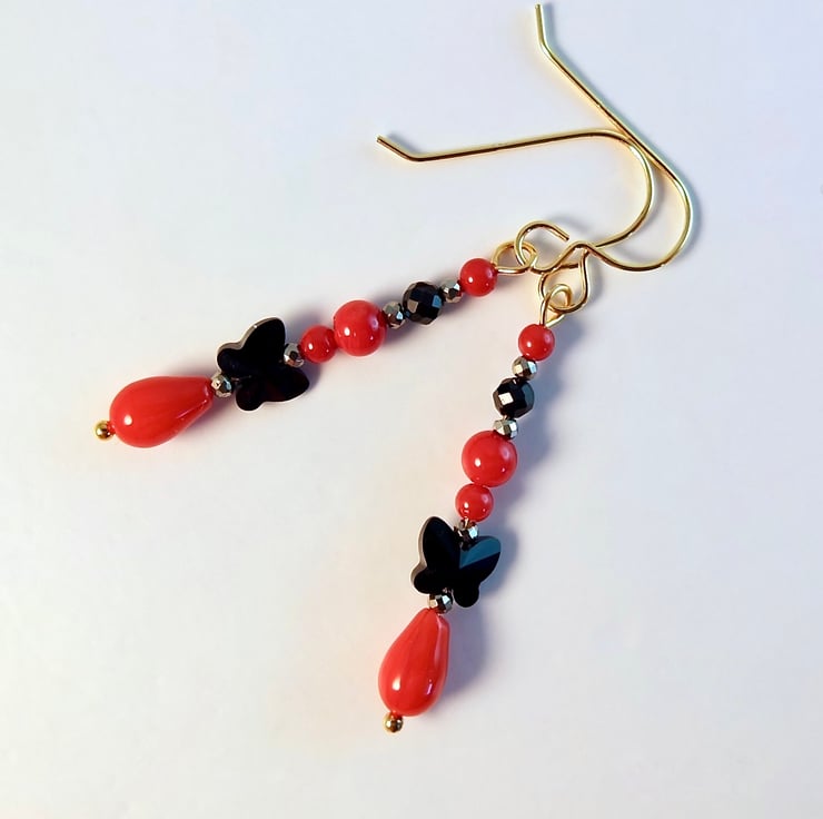 Pretty, Sparkly earrings, each featuring an assortment of red Bamboo Coral beads, a 6mm 'jet' Swarovski butterfly, a 3mm AAA grade faceted black Spinel bead and tiny, 2mm, AAA grade faceted Pyrite spacers giving extra sparkle.