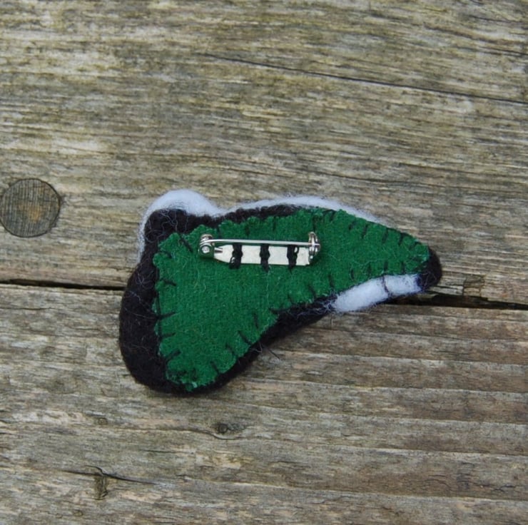 A needle felt wool brooch of a badger's head.