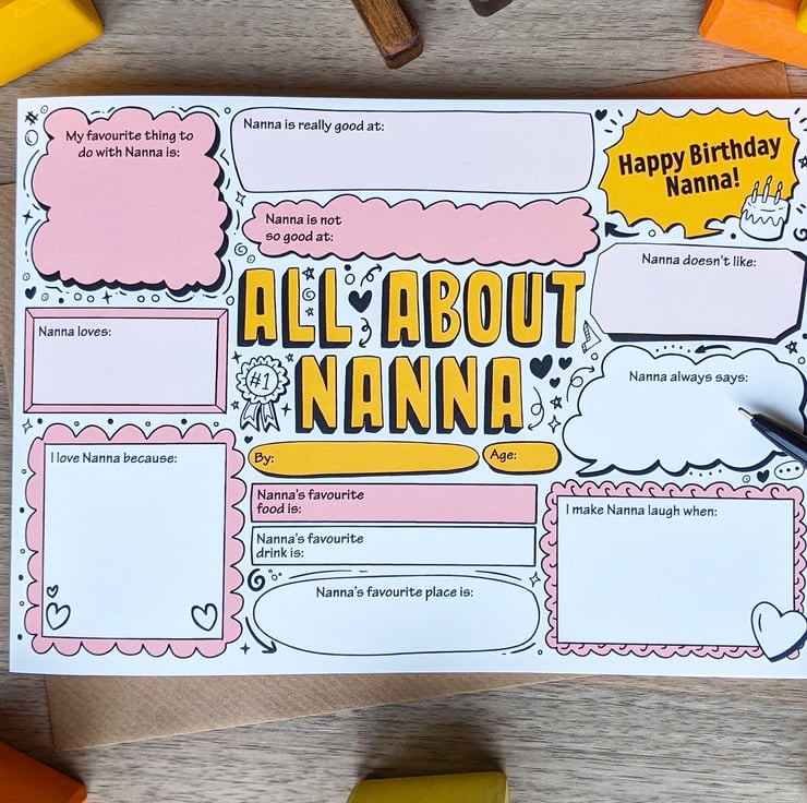 Grab a pen, ask Nanna’s special little grandchild the questions on the front of the card and then simply write in their answers (or for older kids, let them write in their own answers!) to create a totally unique and personal birthday card.