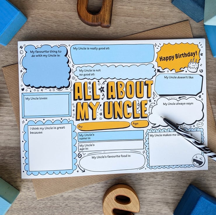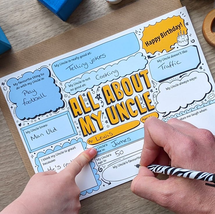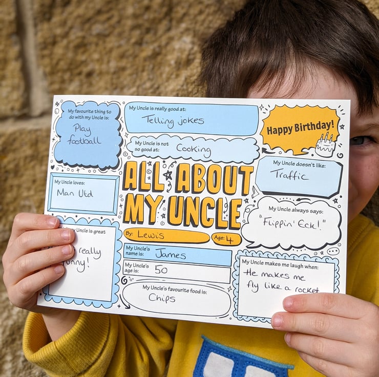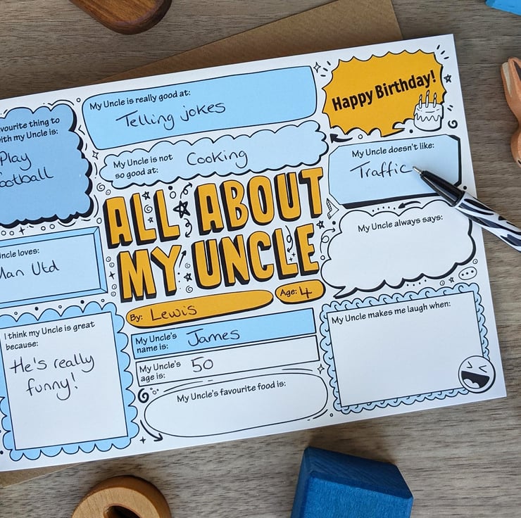 Find out all about a super Uncle from a child's perspective with our fill in the blanks Q&A birthday card!