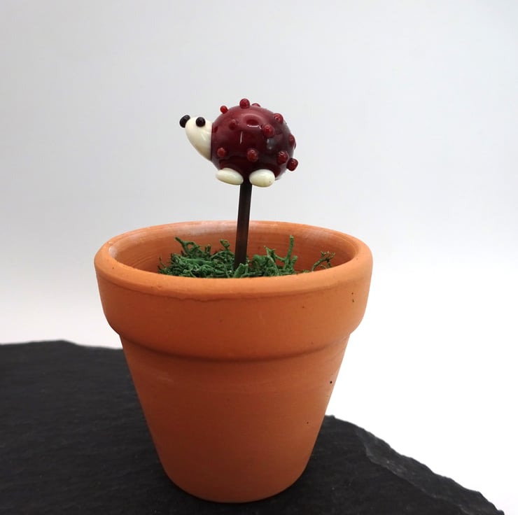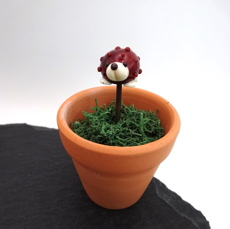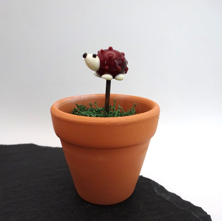 A little ceramic flower pot which features a handmade lampwork glass hedgehog.