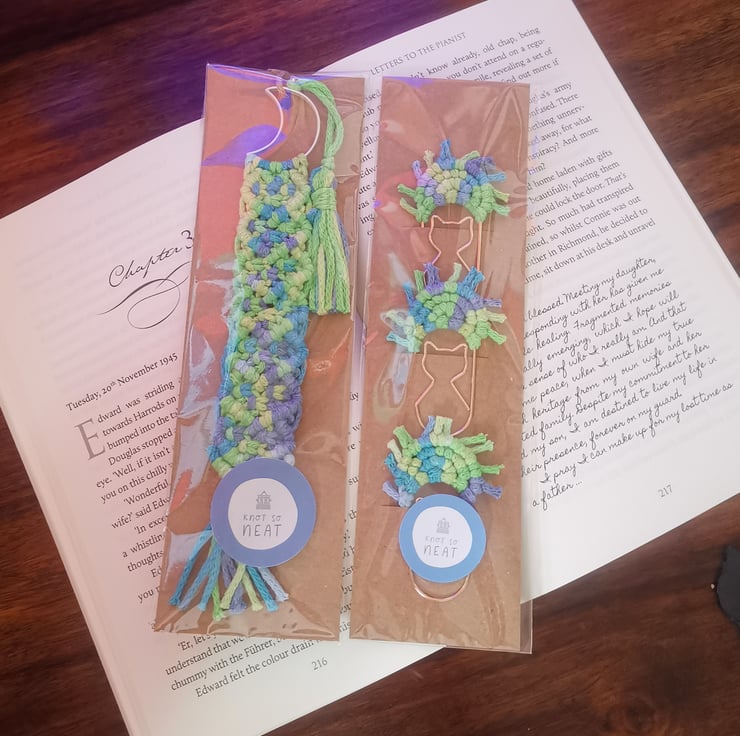 Bundle of one regular bookmark and one set of 3 bookmarks/paperclip page markers, as pictured.