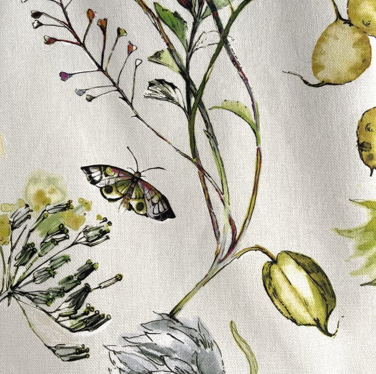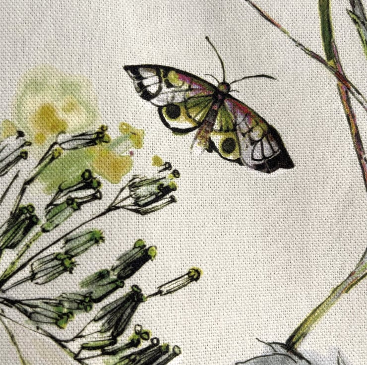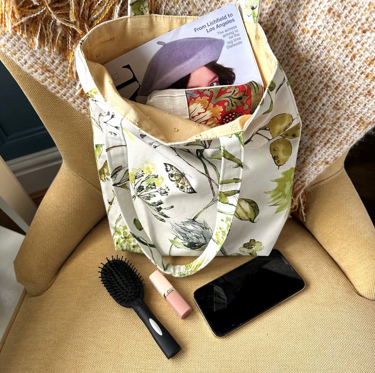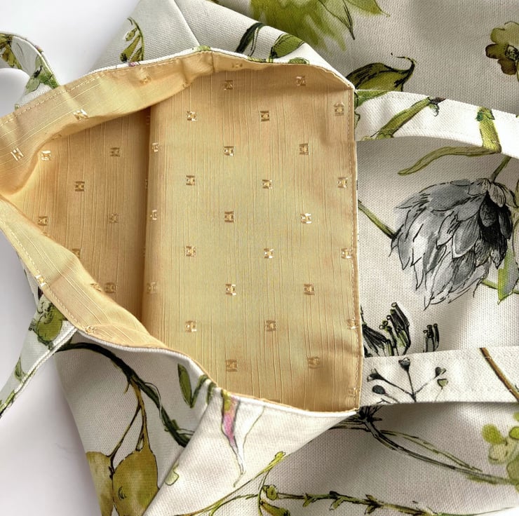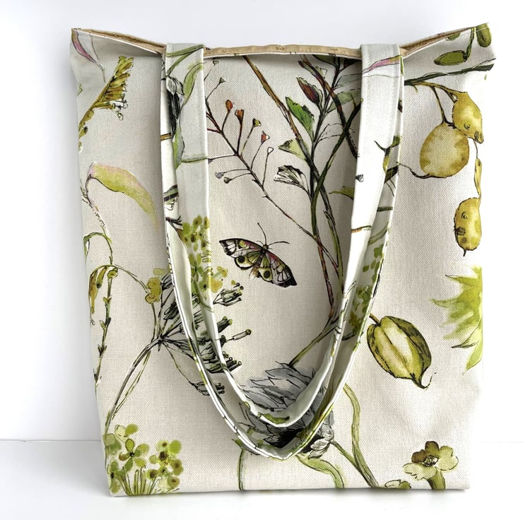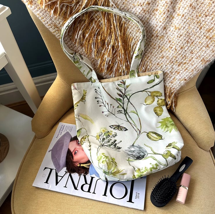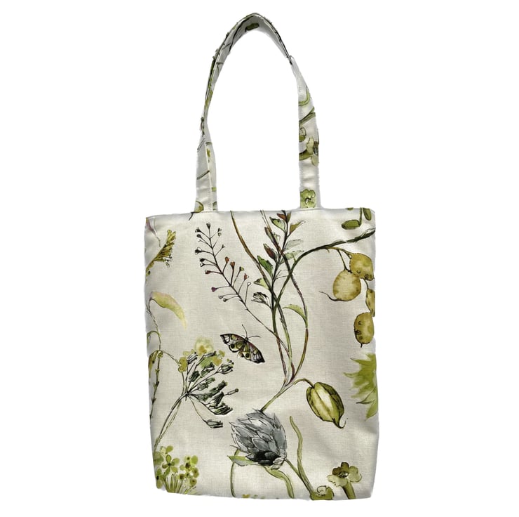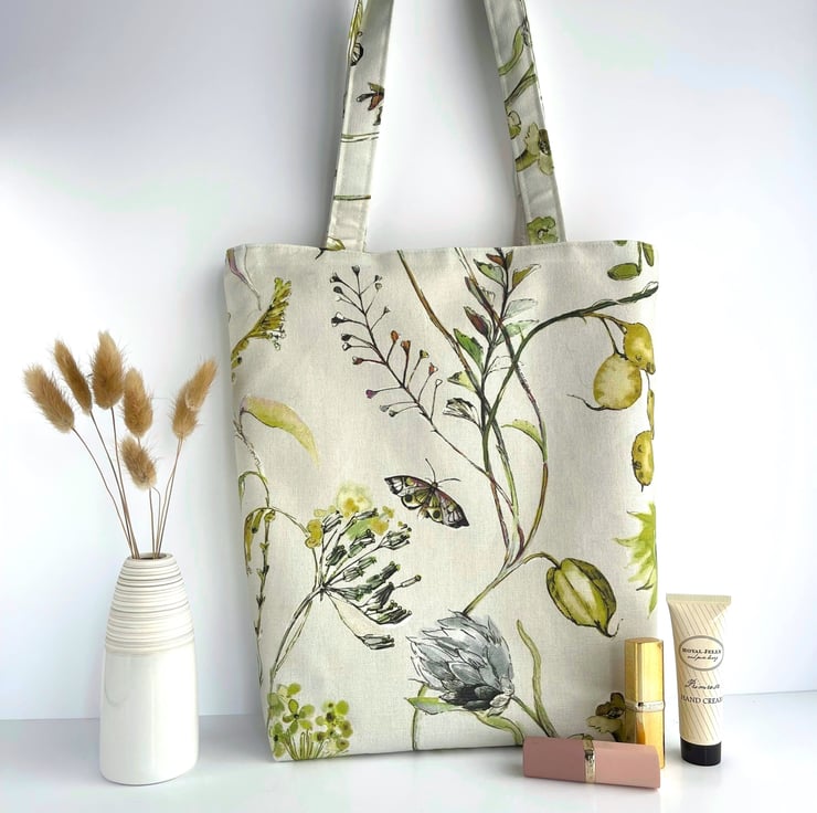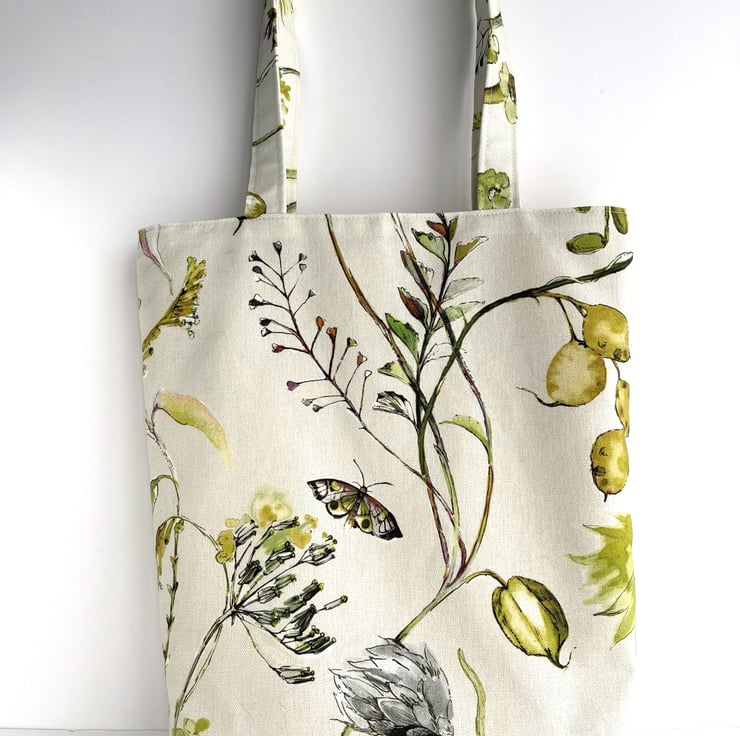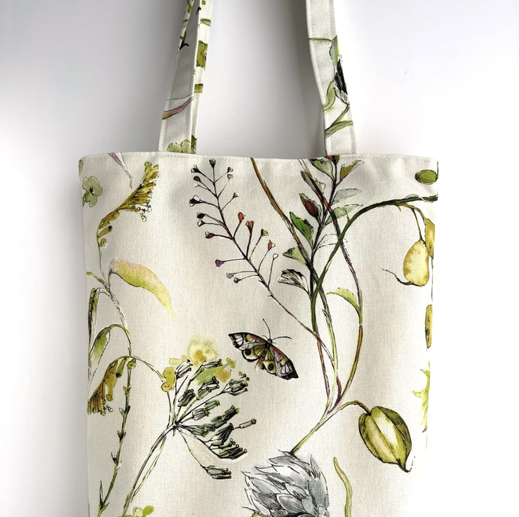 Floral tote bag with seed heads and butterfly. This fresh-looking tote bag is made from print fabric with a botanical pattern featuring flowers and seed heads on leafy stems. A butterfly is fluttering amongst the plants. The fabric is cream and the pattern is depicted in shades of zesty green, olive green and grey, with tiny accents of magenta, ochre and golden brown. The tote bag is lined with fabric in a lovely shade of buttermilk, with a woven pattern of small squares.
