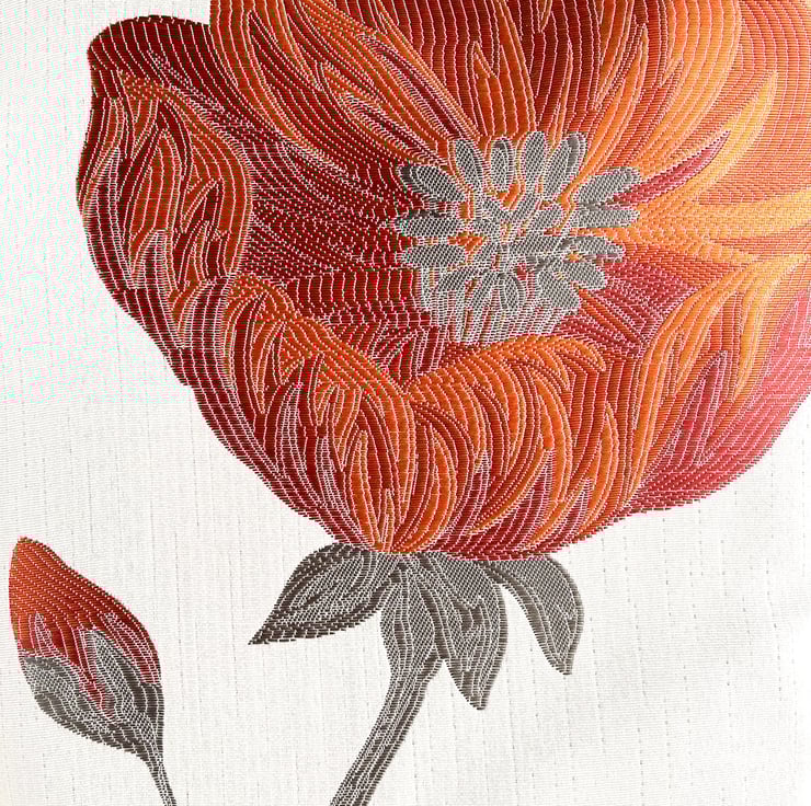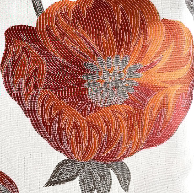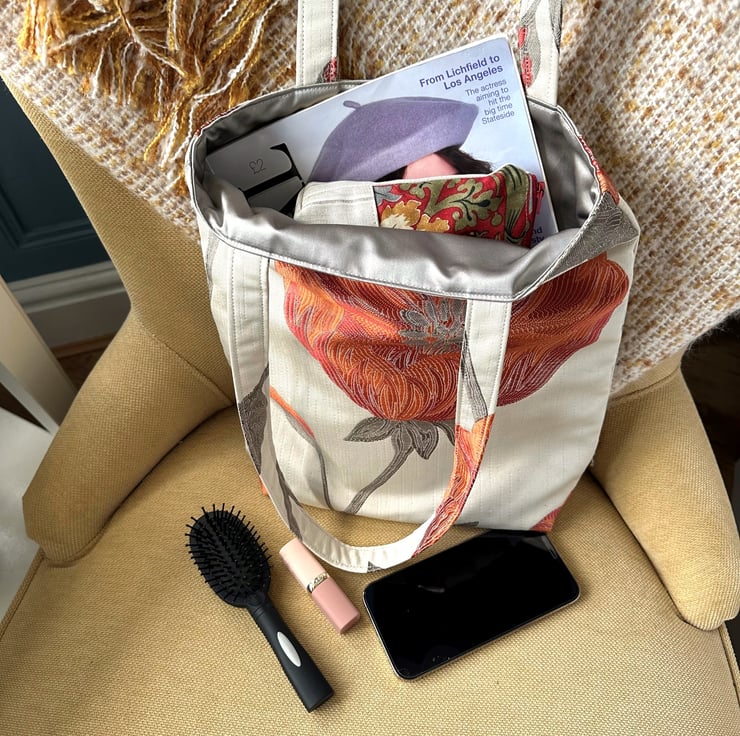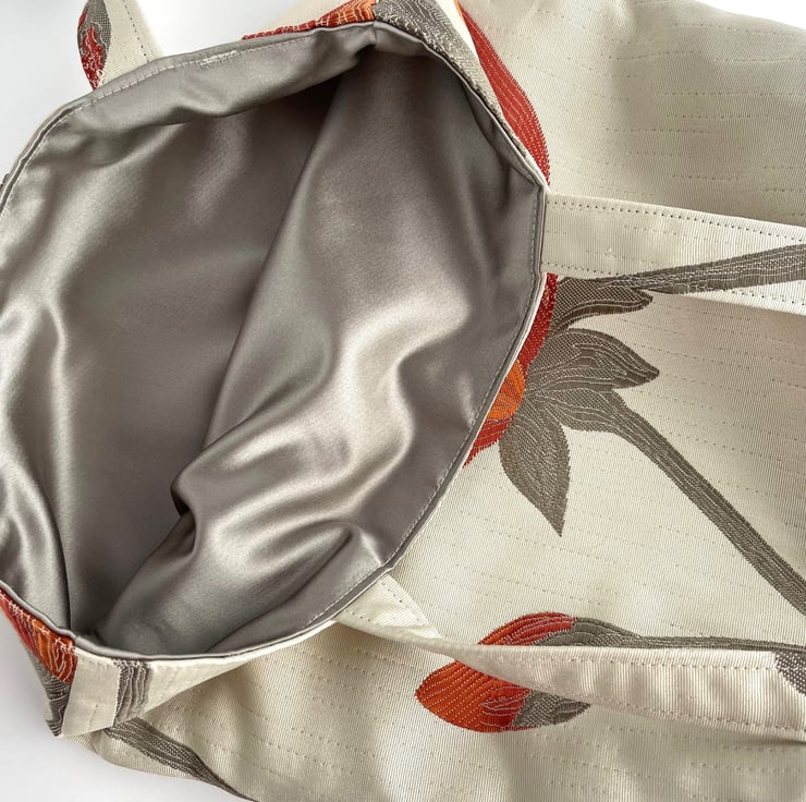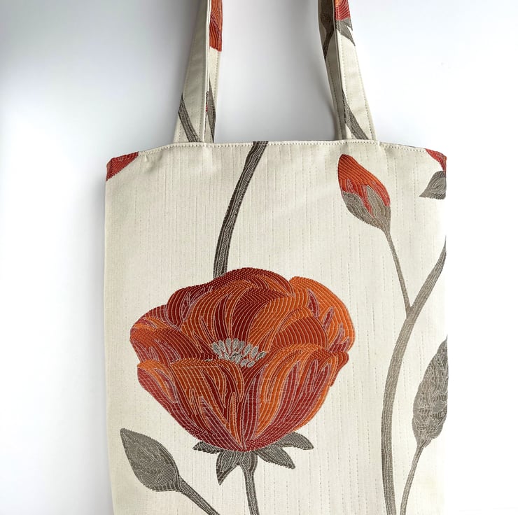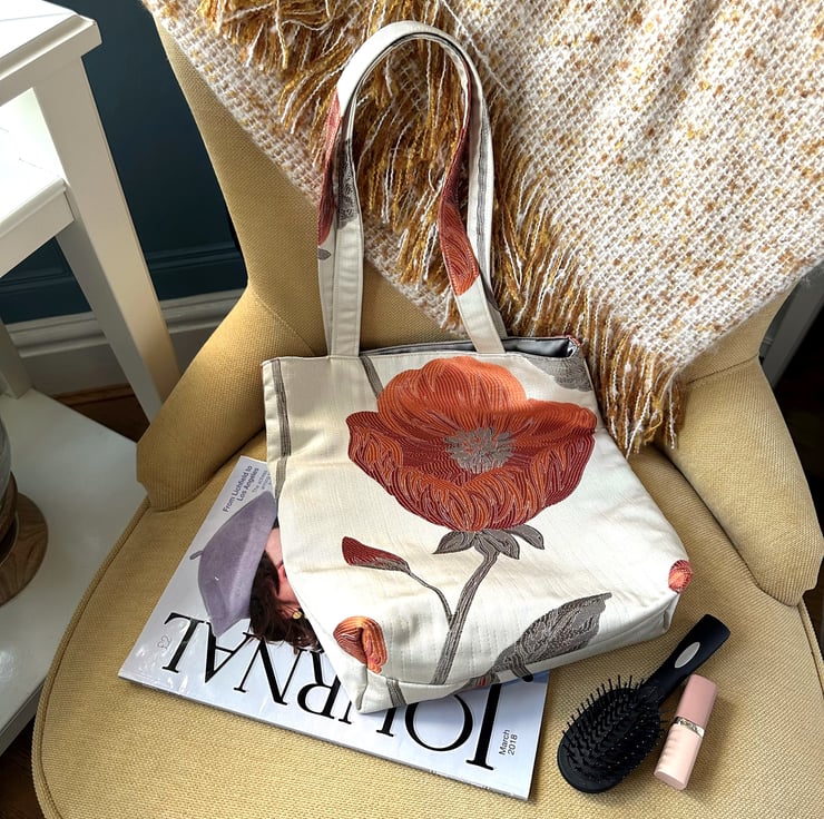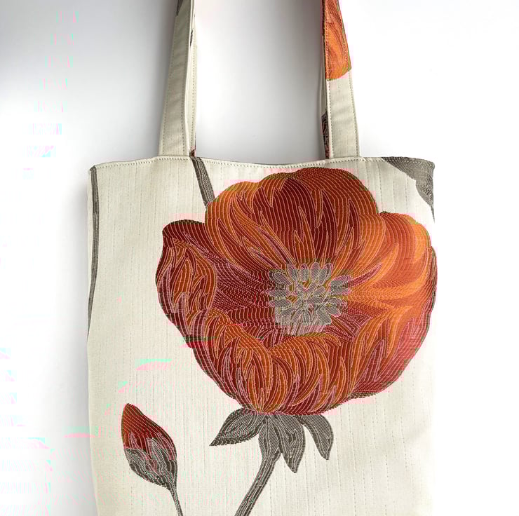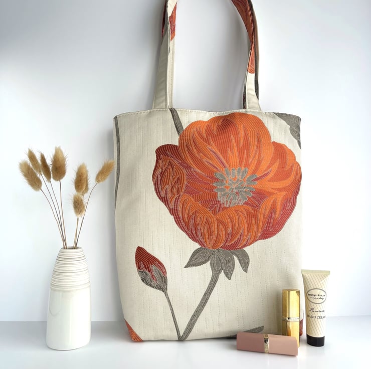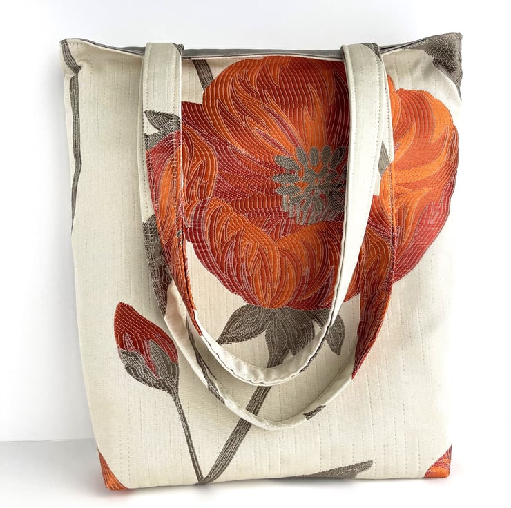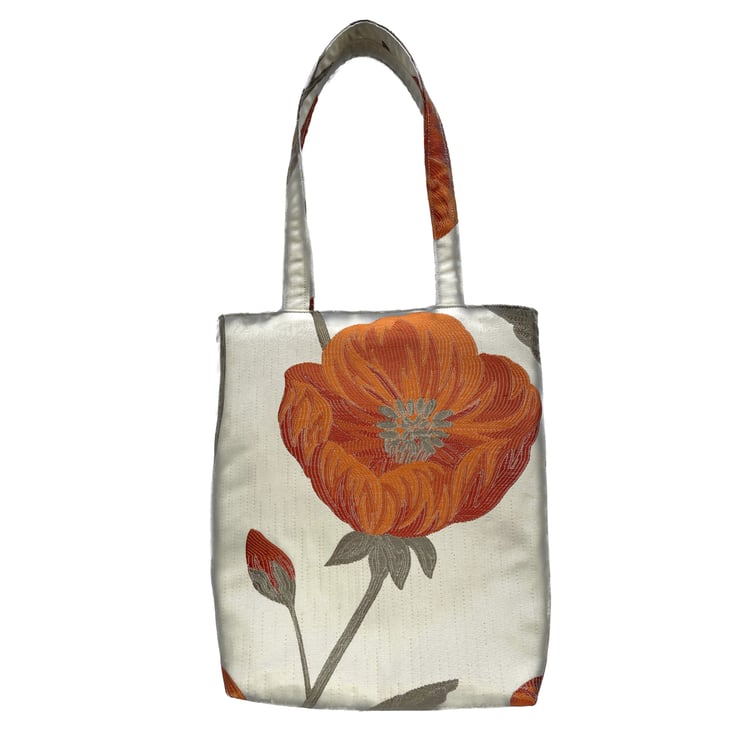 Cream tote bag with a large orange and red poppy. This stylish tote bag is made from lovely jacquard fabric which features a large poppy on a cream background. The poppy is made up of shades of orange and red, and has grey stamens in the centre. It sits on a grey stem, along with a partially opened bud. The floral pattern has a slight sheen, and the colours catch the light beautifully. The bag is lined with grey satin, which co-ordinates nicely with the grey accents in the outer fabric.