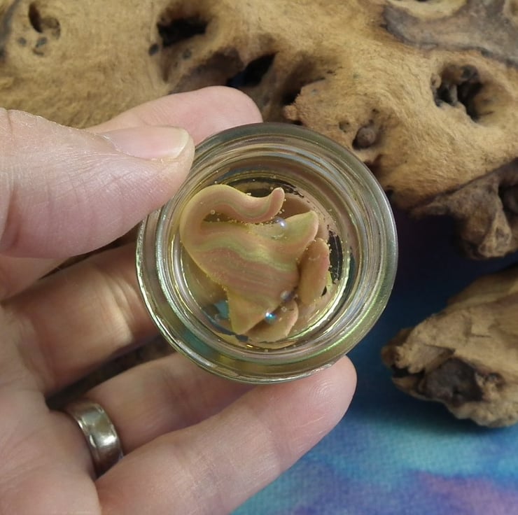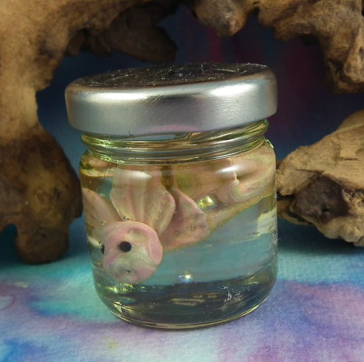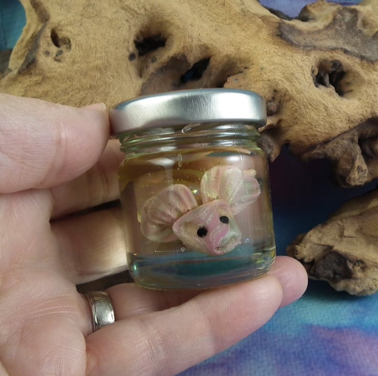 A 'one of a kind' creation having been entirely handmade without the use of moulds here at my studio on the Sussex Coast. Modelled with artist blend polymers before sealing with lacquer, Mae is in a two inch glass jar ... she is not removable.