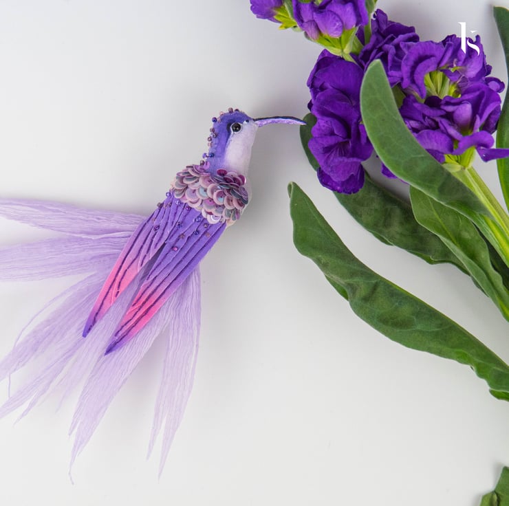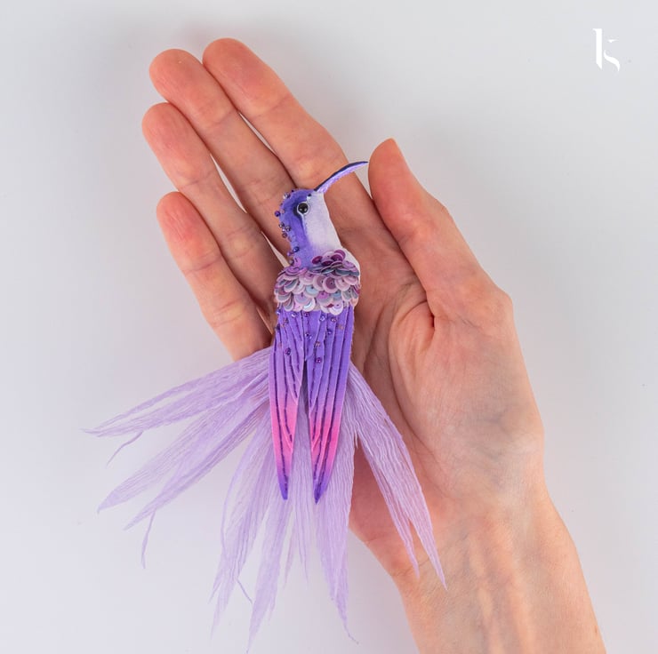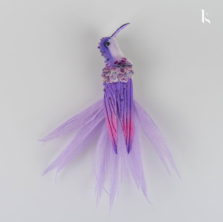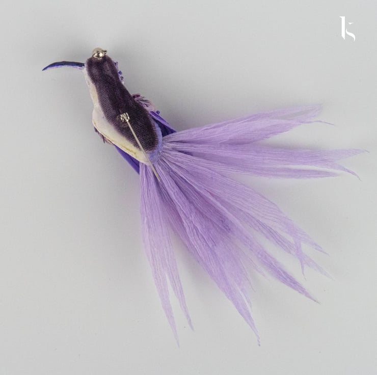 This small hummingbird brooch from the “Bird Park” collection presents a distinctive colourful design. Adorned with complex detailing, the embellishment has an upbeat (even holiday) feel. It only seems fragile. The beak and wings are rigid and safe for clothes.