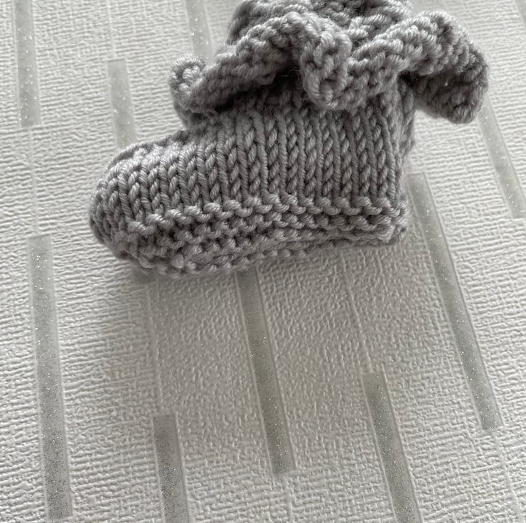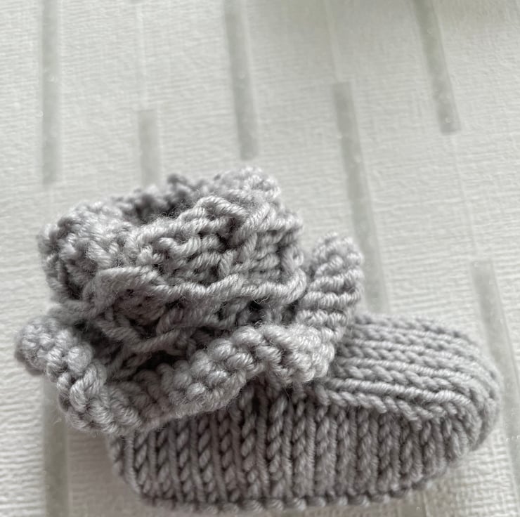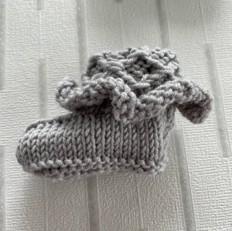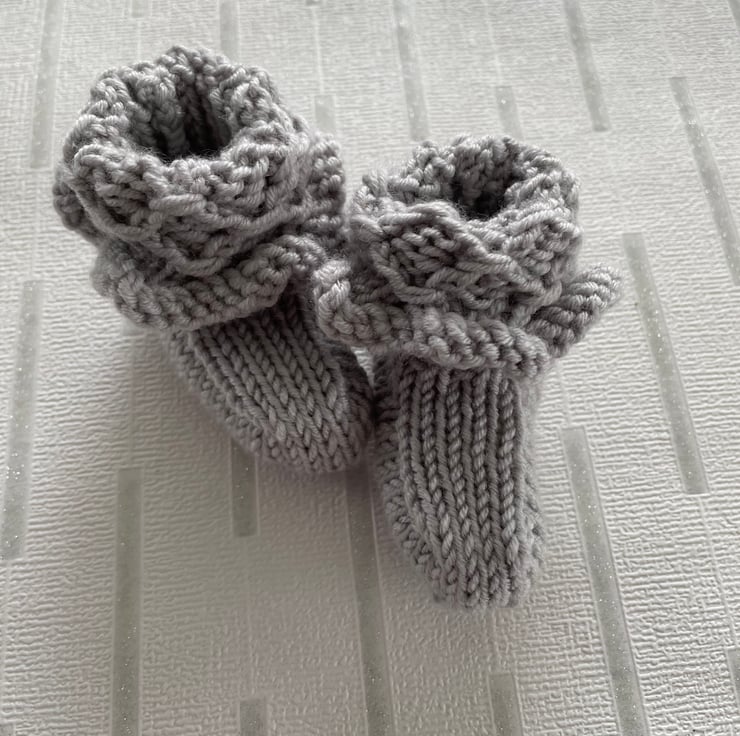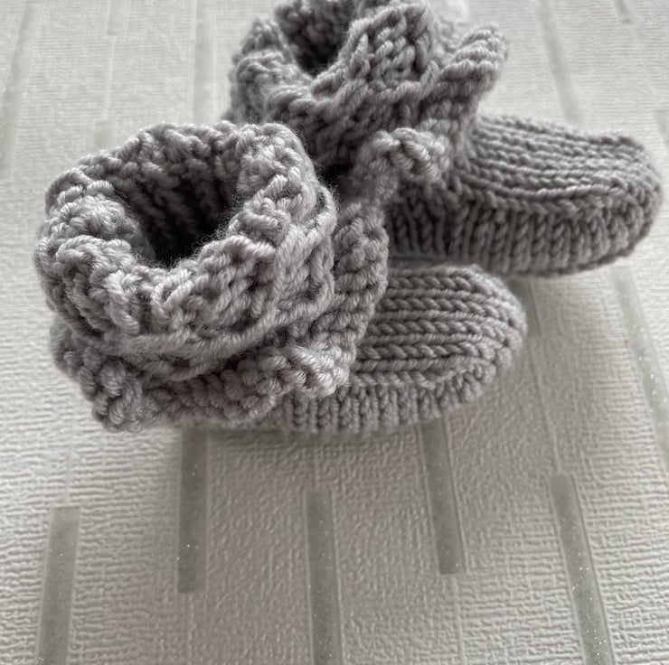 A pair of bootees hand knitted in a mixed fibre yarn. They are folded over at the ankle to reveal the patterned frilly top.