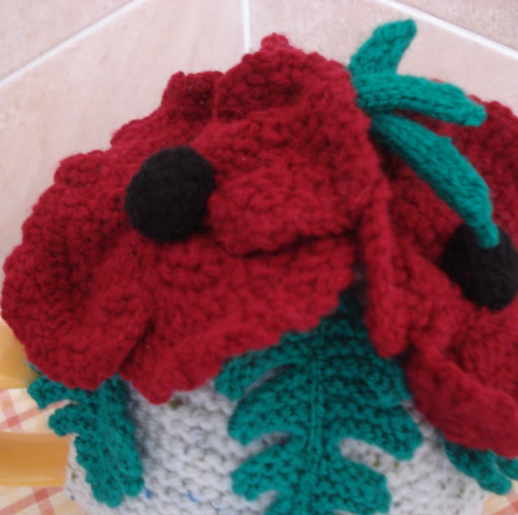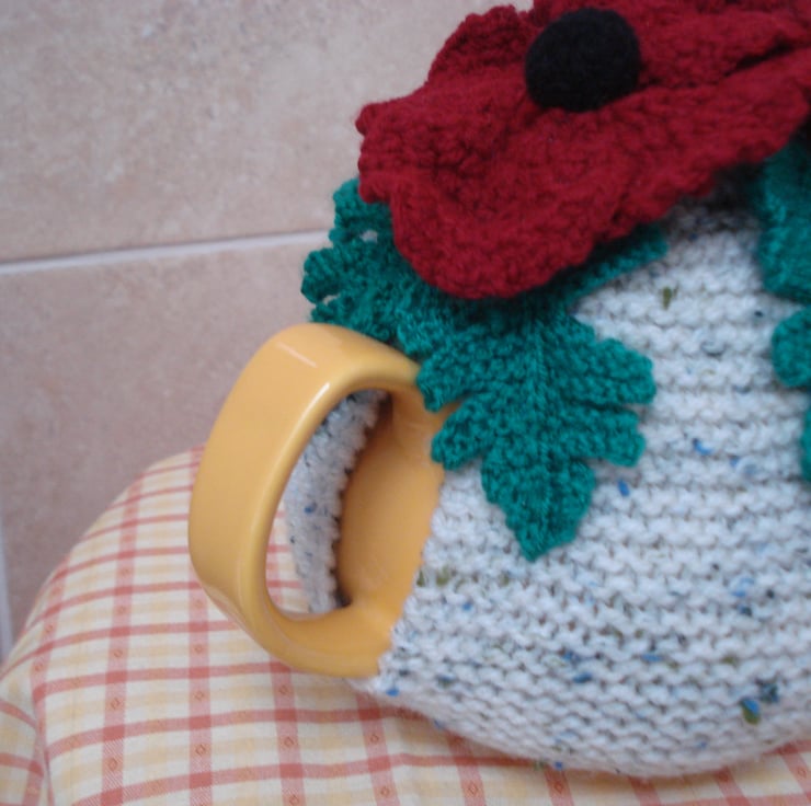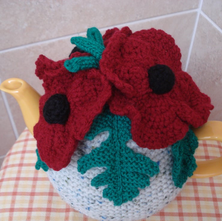 This is a hand knitted 4-6 cup tea cosy with three large crochet poppies and green leaves and stems. All sewn on to a beige blue tweed like base. Will fit a 4-6 cup teapot. Please note teapot not included.