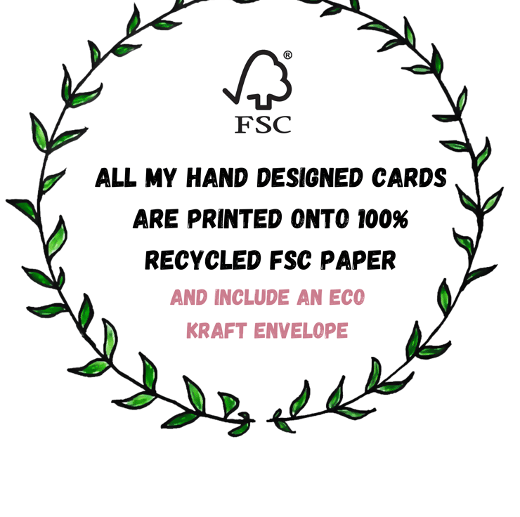 This planet is precious - so doing your bit by buying this eco-friendly card will go a long way. There is limited carbon emission as this card was created entirely in the county of Somerset! I use Royal Mail which has the lowest reported carbon emission per parcel of any major UK delivery company. And as mentioned, no plastic is used, and all paper used has been recycled!