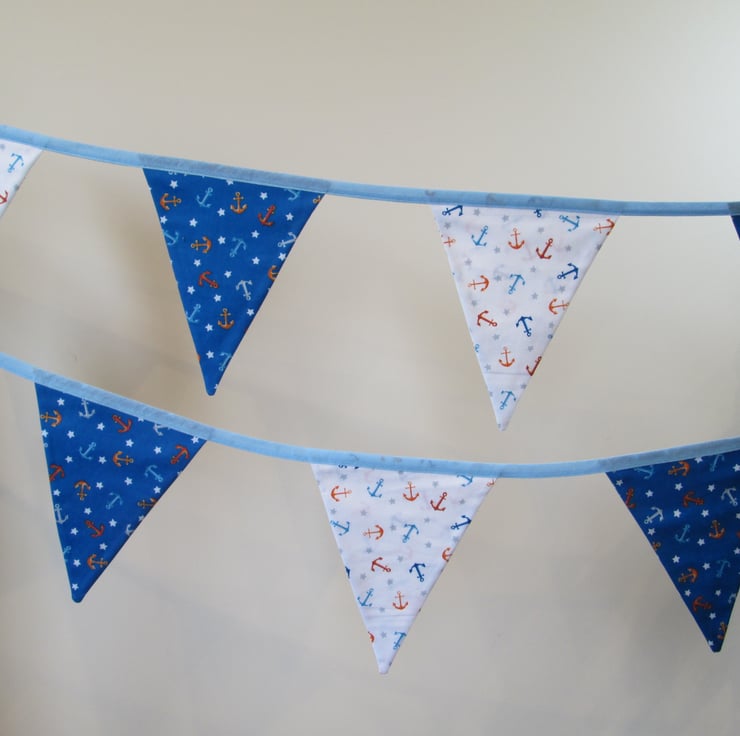 This bunting would be a beautiful addition to any home or boat. Pennants made from 100% cotton fabric featuring an array of colourful anchors on alternate blue and white backgrounds. Eleven flags, are arranged on pale blue bias binding tape the same fabric is used for each side so it can be hung either way, pennants measure approximately six inches across and seven and three quarter inches to the point (15 cm x 20 cm). There is approximately a tape gap of 3.5 inches (9 cm) between each flag and about 15 inches (38 cm) of tape at each end to aid displaying. Overall this string of bunting measures approximately 11 ft 1 ins (3.36 m). Created in a smoke and pet free home, designed as a decoration not a toy.
