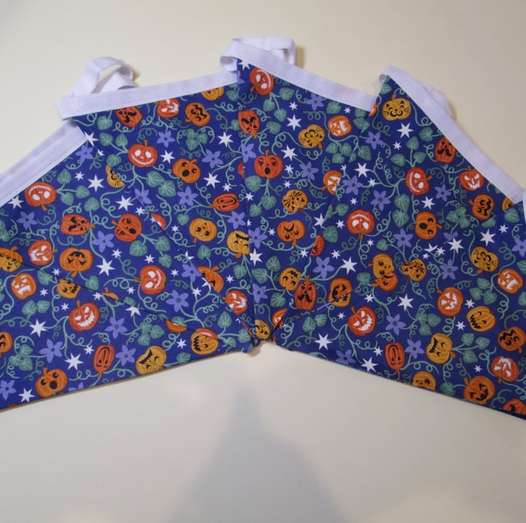 This bunting would be a beautiful addition to any home. Pennants made from 100% cotton fabric featuring a selection of smiling pumpkins with stars that glow in the dark. Twelve flags, are arranged on white bunting tape the same fabric is used for each side so it can be hung either way, pennants measure approximately six inches across and seven and three quarter inches to the point (15 cm x 20 cm). There is approximately a tape gap of 3.5 inches (9 cm) between each flag and about 15 inches (38 cm) of tape at each end to aid displaying. Overall this string of bunting measures approximately 11ft 11ins (3.63 m). Created in a smoke and pet free home, designed as a decoration not a toy.