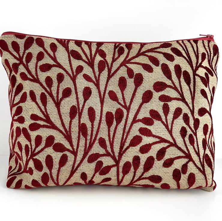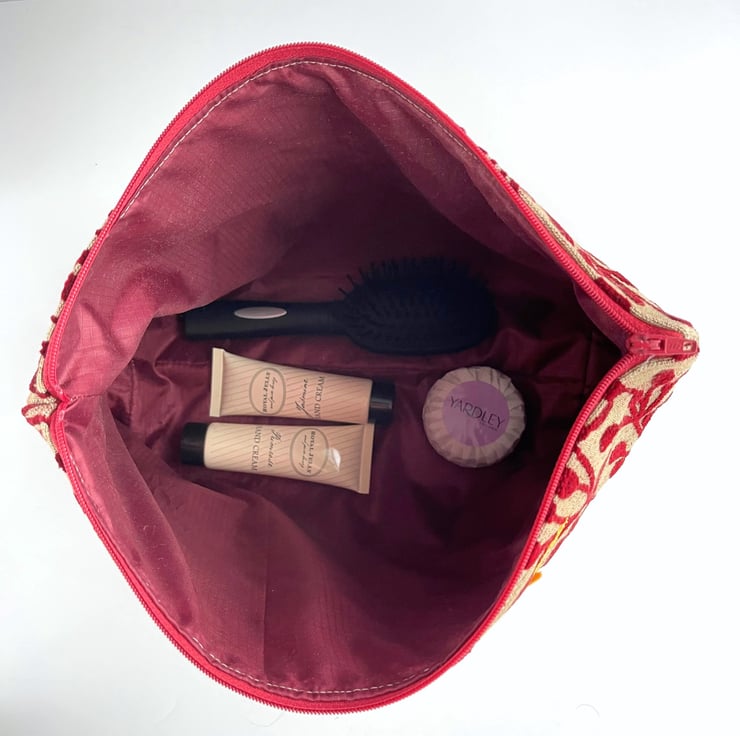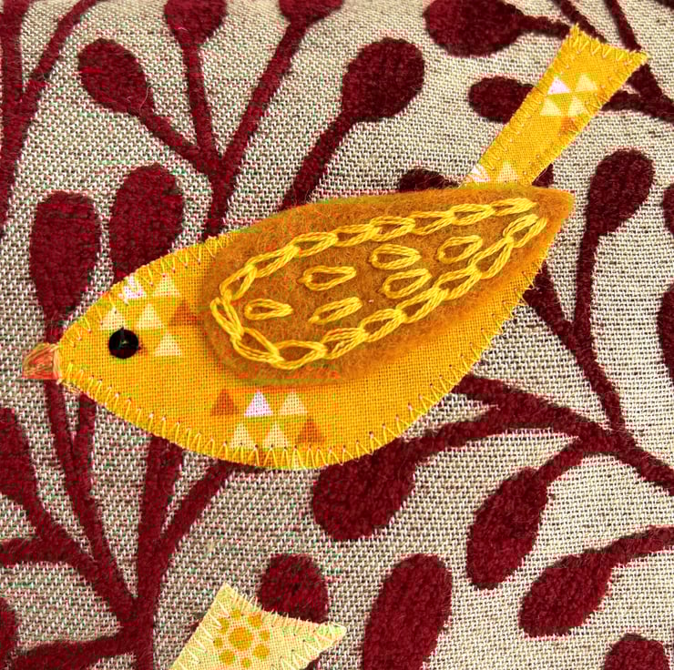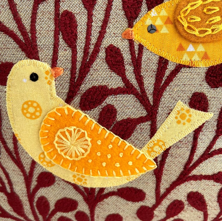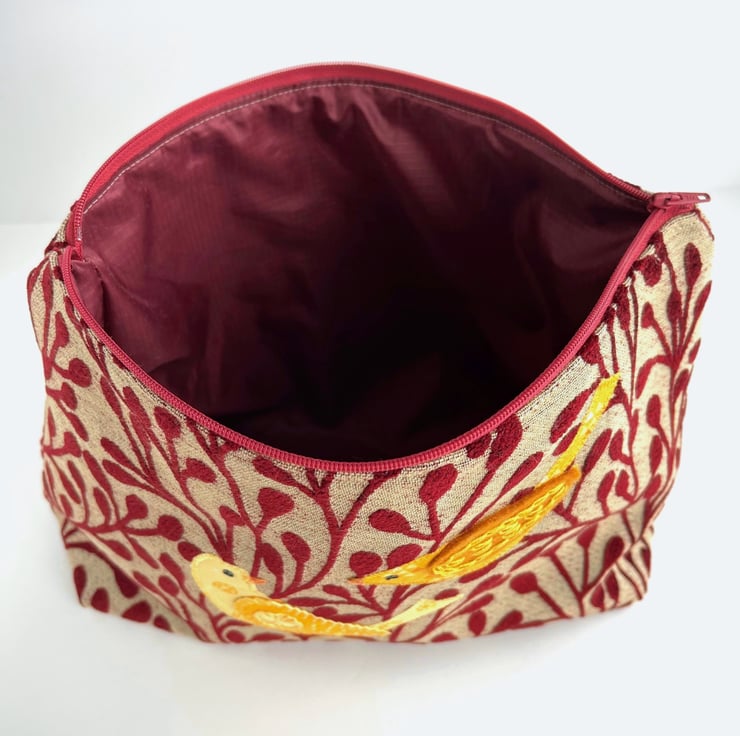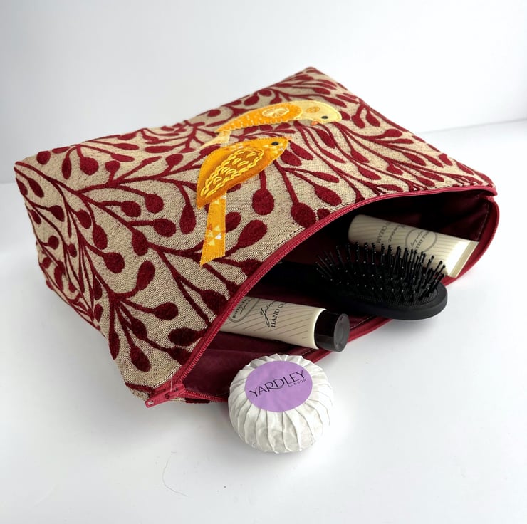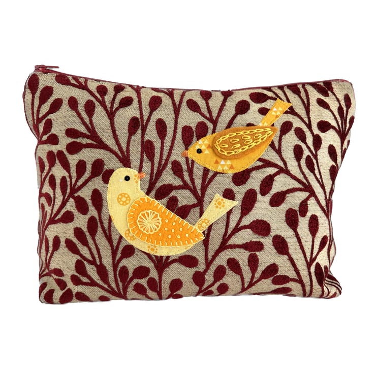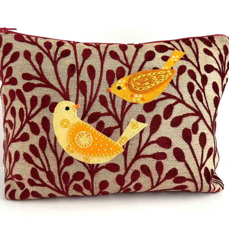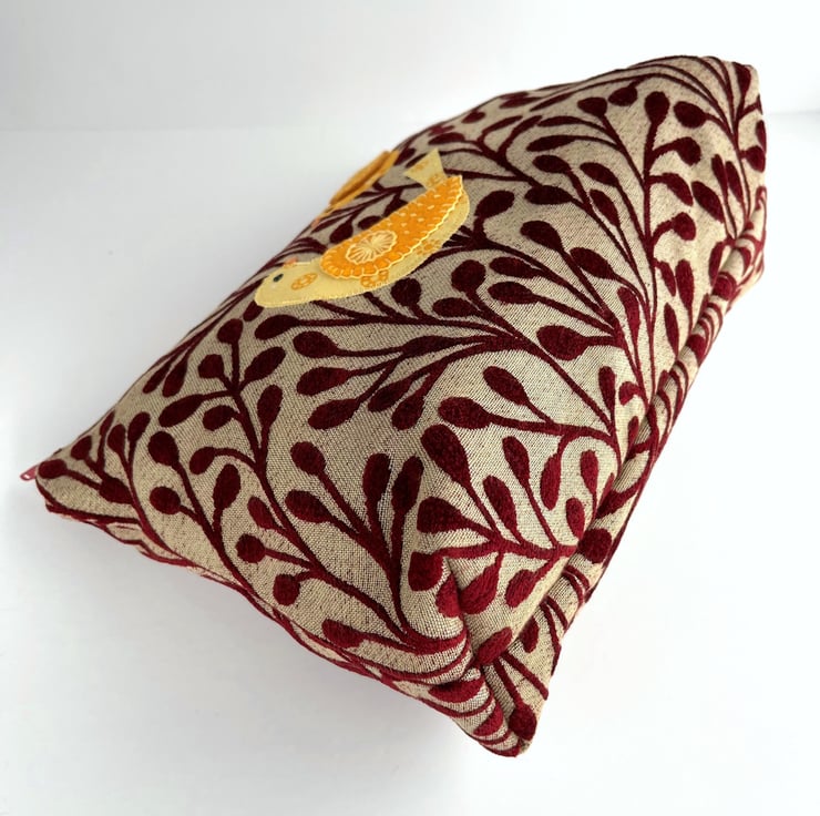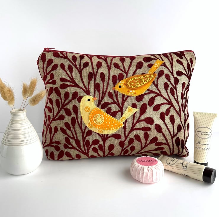 Toiletry bag with folk art style birds. This unusual wash bag is made from luxurious leafy brocade fabric with two appliqué and hand-embroidered birds. The brocade fabric is beige with a velvety, textured raised pattern of burgundy leafy stems. The folk art style birds are made from print fabric, and each has a felt wing. One is yellow and orange, and one is yellow-orange and ginger. On each of the felt wings, I’ve hand-embroidered patterns in a variety of stitches, to give the birds a folk art look. Their beaks are hand-embroidered, and I’ve given them black sequin eyes. The toiletry bag fastens with a matching burgundy zip and is lined with burgundy water-resistant fabric. The base of the bag is boxed to give extra space inside for all those essential items.