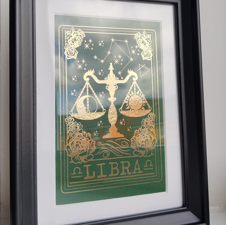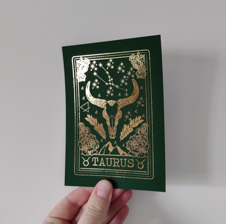 The 12 twelve horoscope star signs depicted as the rotting flesh has weathered away leaving only the bones of the animal parts and skeleton vessels. Below the image represents the element associated with the start sign and the constellation above it. I created this artwork to be full of symbolism it's from my heart as is all my artwork, postcard size print (A6) printed on to forest green 230mg card stock and hot foiled in gold with a laminated texture to help preserve the artwork. Comes unframed.