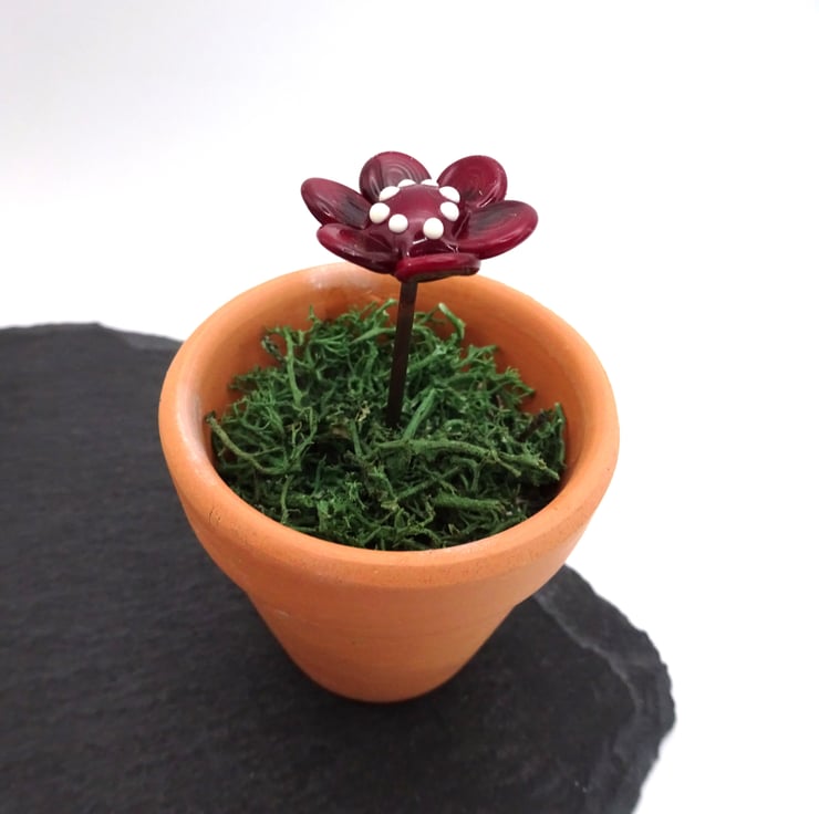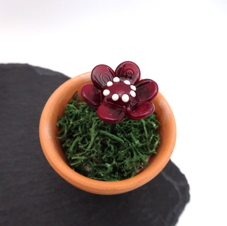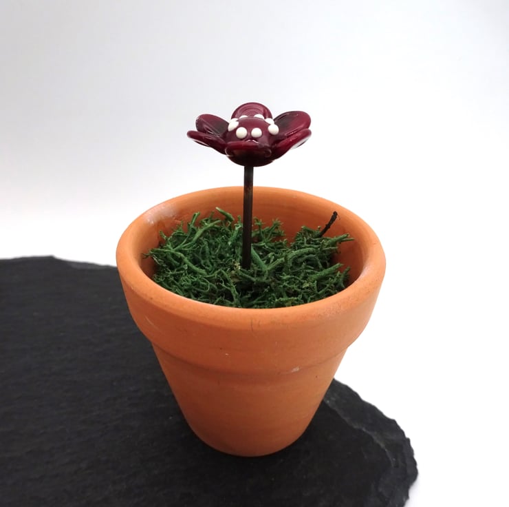 A little ceramic flower pot which features a handmade lampwork glass flower made with dark red glass.
