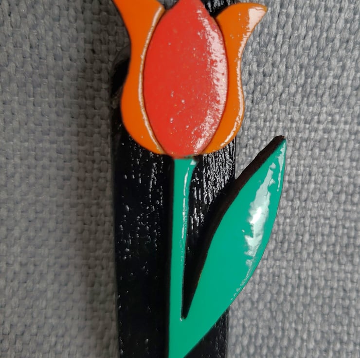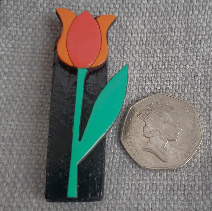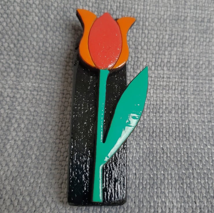 Made using a recycled wooden topper and unwanted canvas pegs with acrylics. I sand and smooth the edges of the pegs then paint. I paint each topper a unique colour combination and attach to the pegs. These are fun, colourful, one-off brooches made using materials which would have been just thrown away.