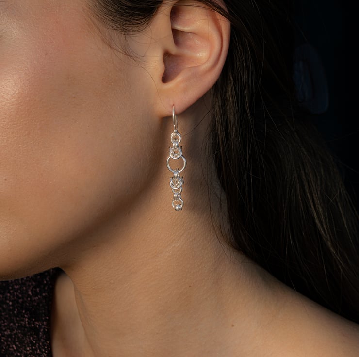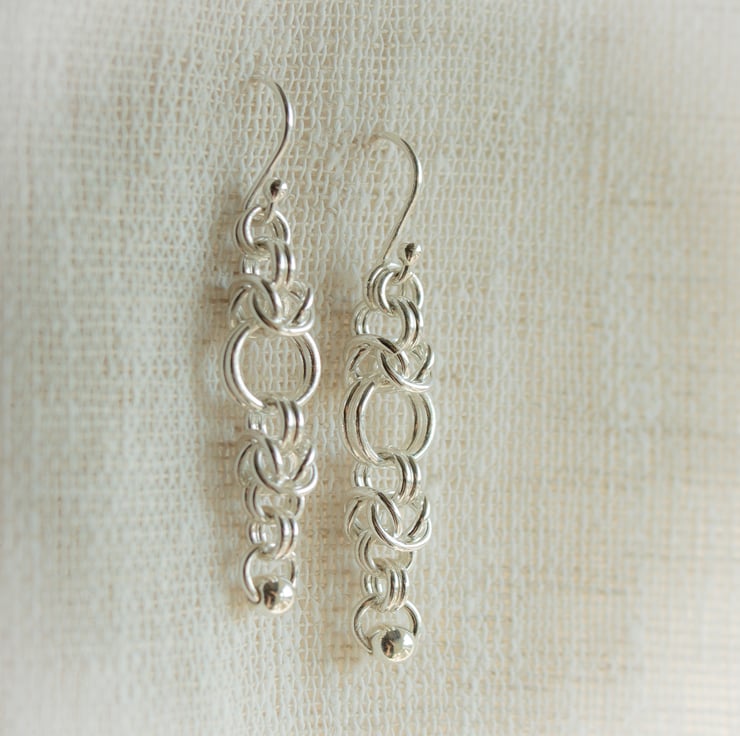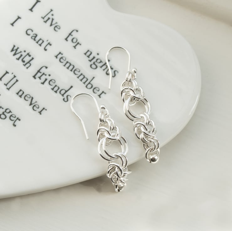I make these drop earrings in a Byzantine style link and then finish them with a small silver ball on the lower hoop. Each earring is made with 21 solid Sterling Silver rings plus a French Hook on each. The earrings have an overall length of 45mm. They are 10mm at their widest point. Even with all these rings they are still lovely and light to wear and with lots of fluidity they catch the light beautifully