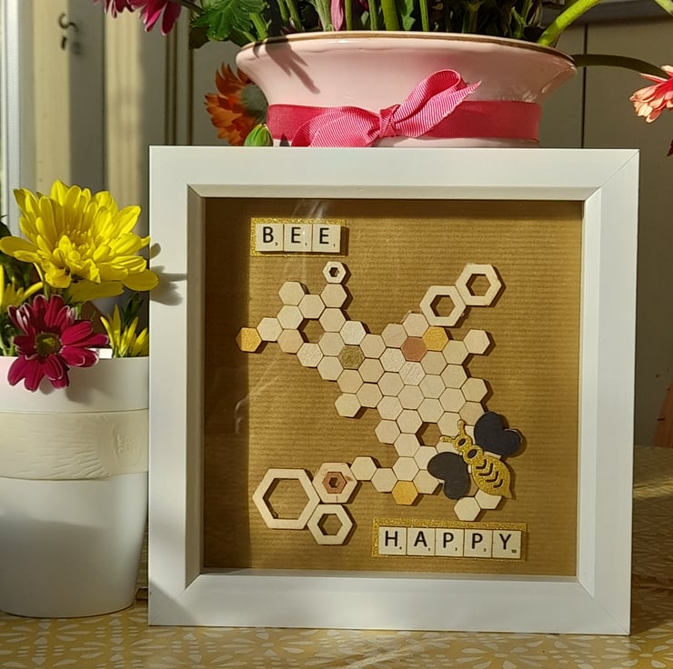 3d box art. Wooden hexagon pieces, a few have been painted with matalic paint for emphasis to create a lovely natural honeycomb with a die cut card bumblebee. The lettering is wooden scrable pieces backed onto a gold glitter card. All mounted on an antique shade of gold background.
