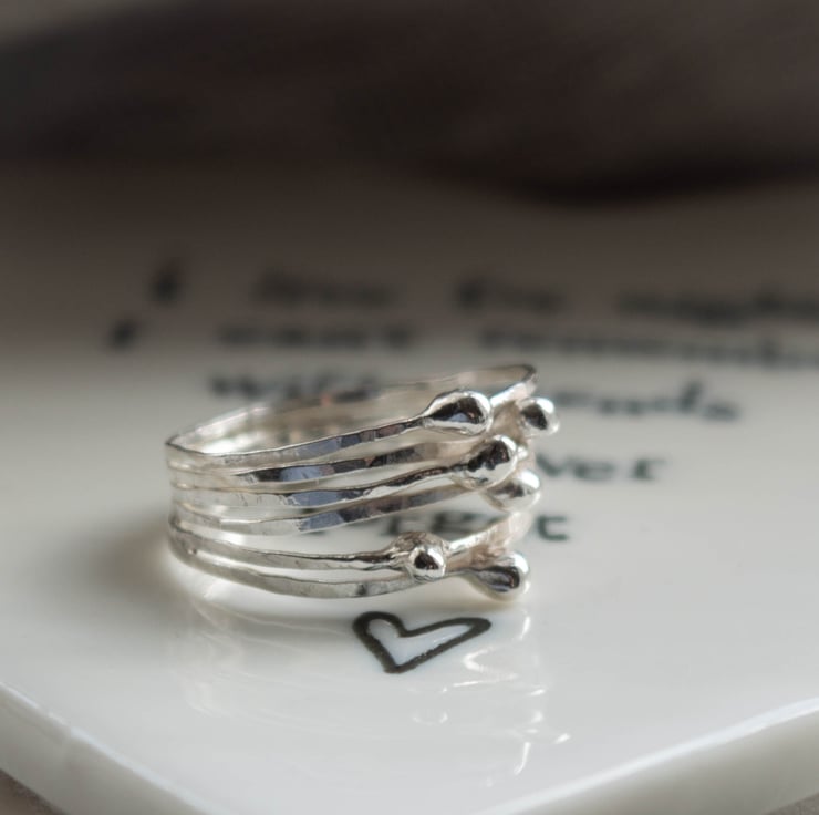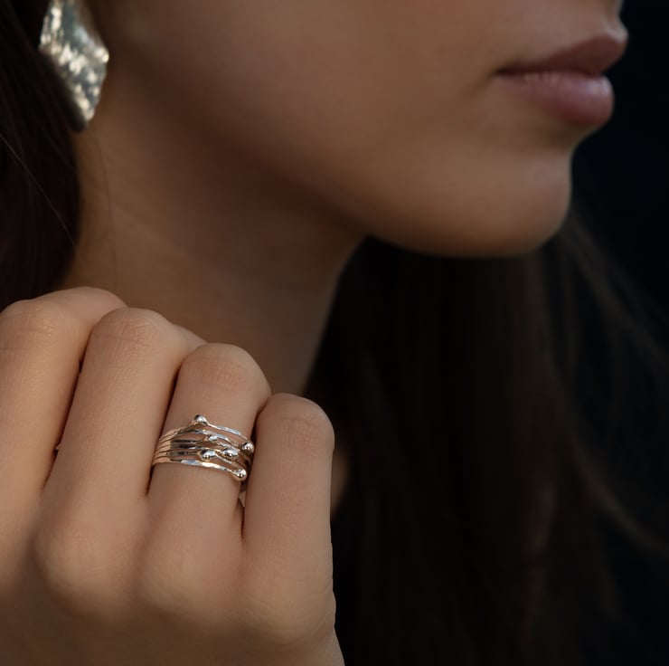 Each light and delicate ring is totally unique as the droplets are formed organically with heat before each strand is gently hammered and then soldered together