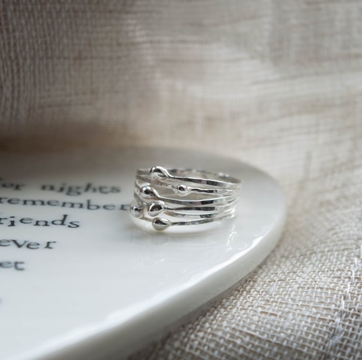 Argentium .940 Silver 6 Strand Ring with unusual droplet effect on each hammered strand
