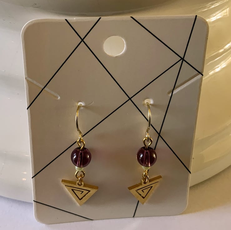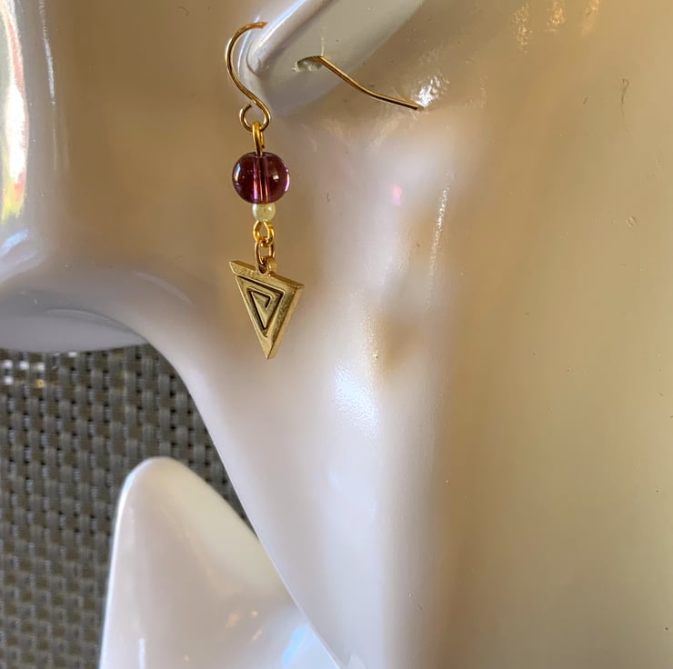 Gold colour triangle earrings with a modern maize design in stainless steel featuring garnet colour glass beads and mini pearls