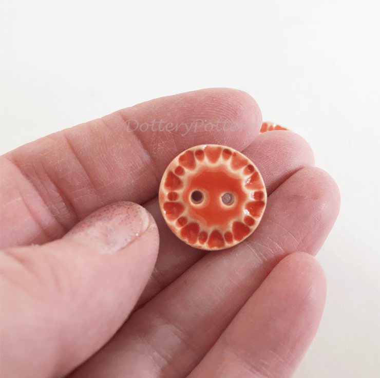 This set of four pottery buttons are made from white earthenware clay, embossed and glazed on the front. They are then fired to 1100 degrees, so nice and strong. They measure 1.8cm across. They can be handwashed or machine washed on a low temperature. Perfect for all sorts of arts and craft projects