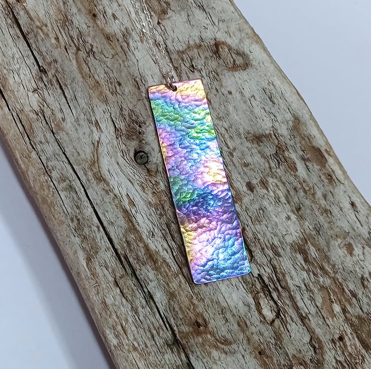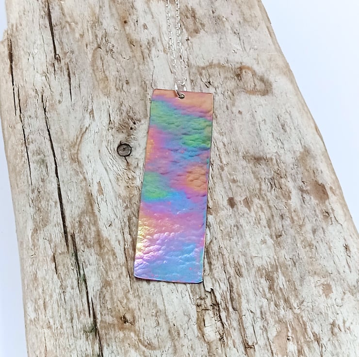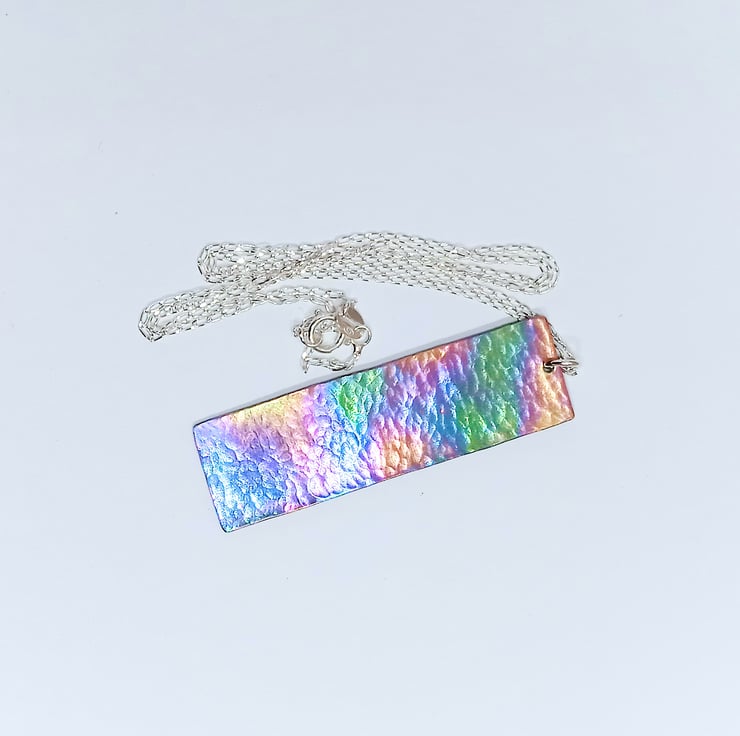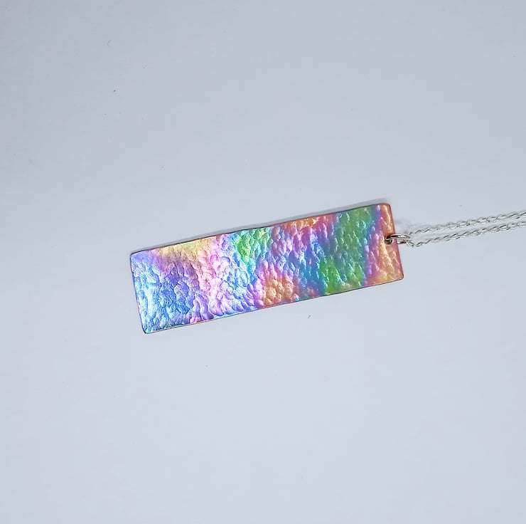 This titanium pendant necklace displays a range of attractive colours which really come to life when it catches the light..
