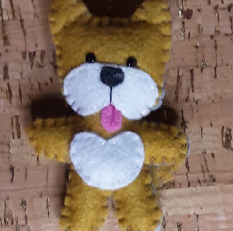 The main colours of the dog are light brown & white. The eyes are made from black seed beads. Nose is made from black felt and the tongue from pink felt. The back is made from light grey felt.