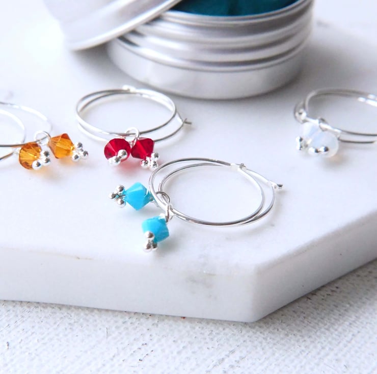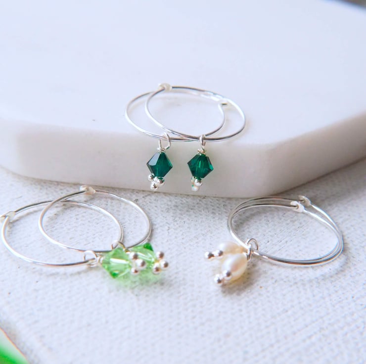 Simple elegant birthstone hoop charm earrings with a bright Crystal charm drop. Made from a thin sterling silver wire hoop, these are modern boho style earrings using a branded crystal. Light to wear and perfect for a hint of colour everyday. .