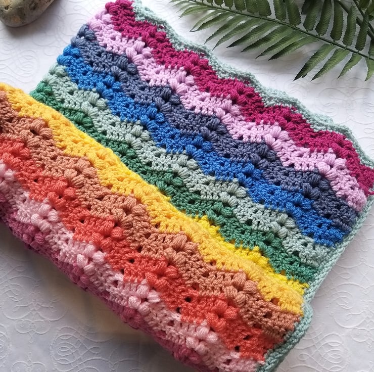Made in vintage rainbow shades this blanket has gentle ripples with cute puff stitches and a duck egg blue border.