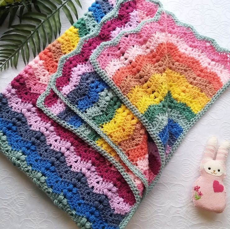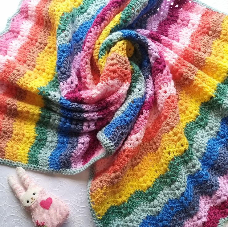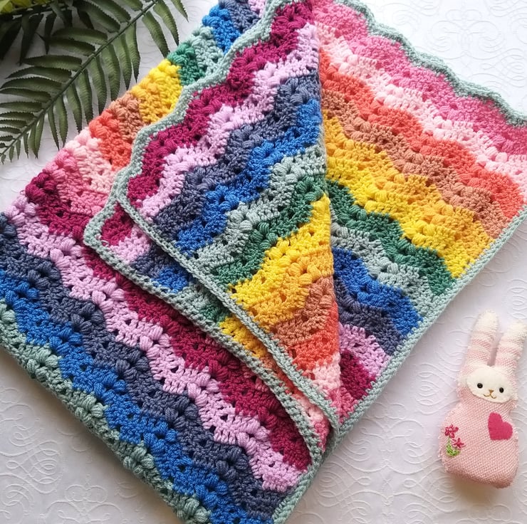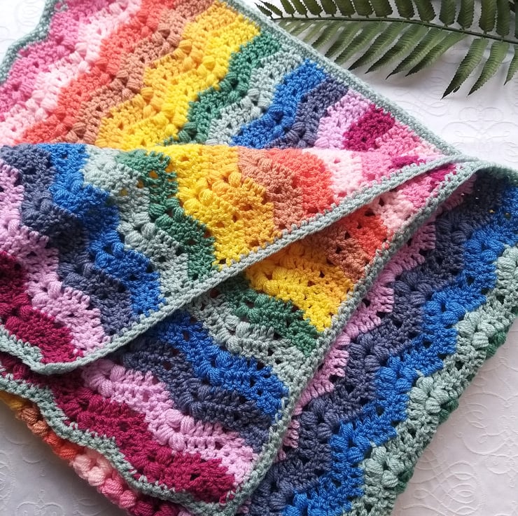 Made in vintage rainbow shades this blanket has gentle ripples with cute puff stitches and a duck egg blue border.