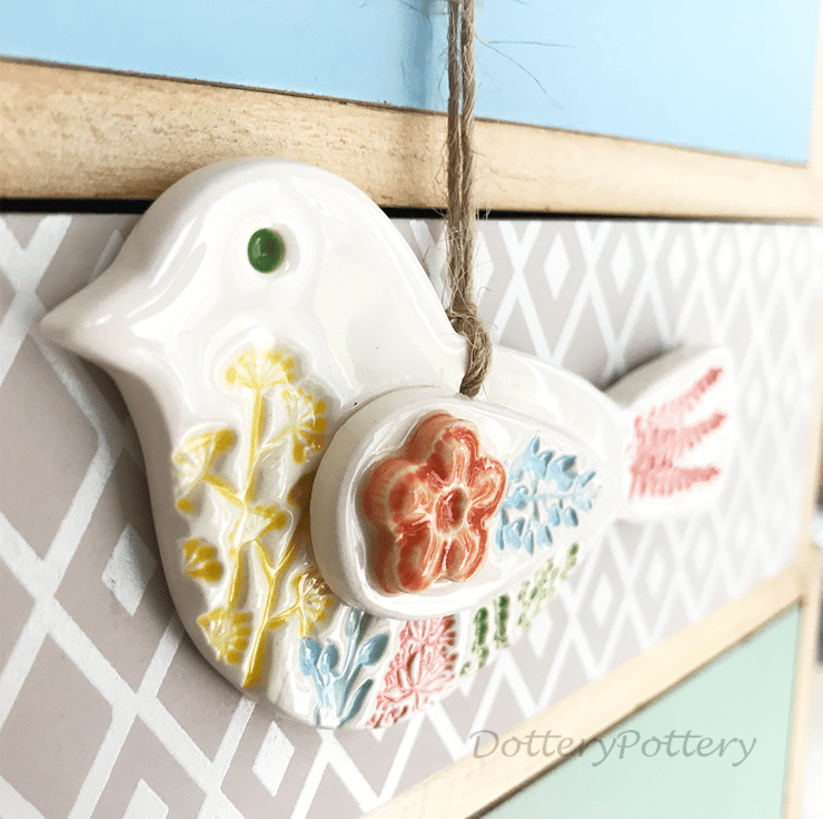 This cute little pottery bird has been hand-cut from white earthenware clay, decorated with colour and fired. It has then been glazed with a lovely glossy clear glaze and fired again to 1100 degrees. It hangs from a cream organza ribbon. 10.5cm wide x 8cm high x 0.8cm deep.