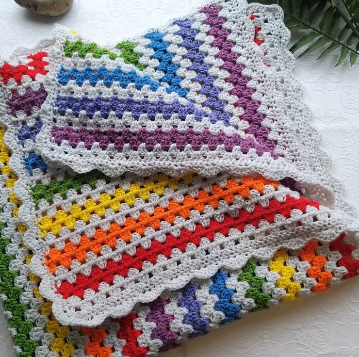 This baby blanket is crochet in a bright palette of rainbow colours against a silver-grey background. Made in the classic ‘granny stitch’ pattern with a shell border.