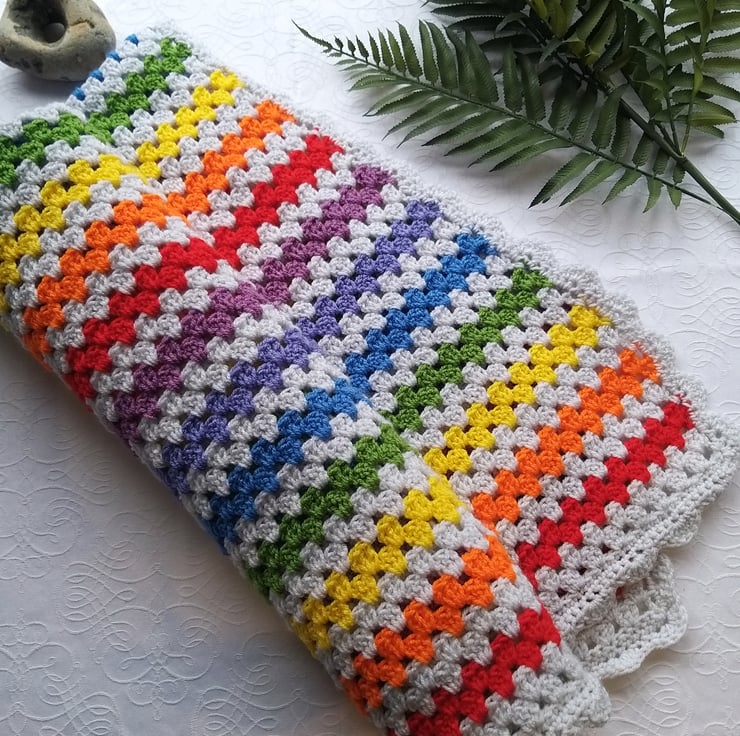This baby blanket is crochet in a bright palette of rainbow colours against a silver-grey background. Made in the classic ‘granny stitch’ pattern with a shell border.